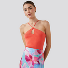 This beautiful coral-colored knitwear is perfect for adding a pop of color to your wardrobe. The lightweight fabric is perfect for layering, and the relaxed fit will keep you comfortable all day long. Whether you're dressing up for a special occasion or just running errands, this piece will add a touch of fun and personality to your look.