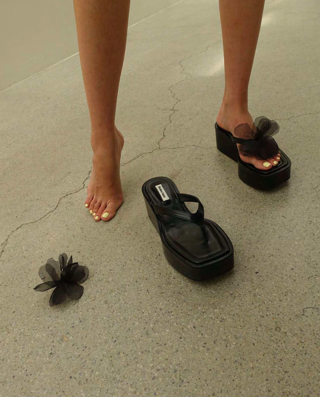 Platform Black Flip Flops with removable flower detail.