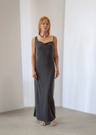 The Lana–a draped maxi dress featuring a cowl neckline, asymmetrical shoulder straps, and a side slit