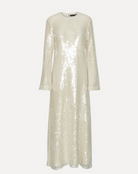 Sequin Maxi Dress Off White features a full-length silhouette with long sleeves and a round neckline. The dress is adorned with all-over sequins and has an asymmetrical seam detail. It fastens with a concealed back zipper for a smooth fit.