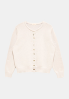 Crewneck cardigan features decorative multi-sized shell + ivory buttons applied at center placket. Functional hidden snap closures secure front. Classic easy fit with rib trim at cuffs + hem.