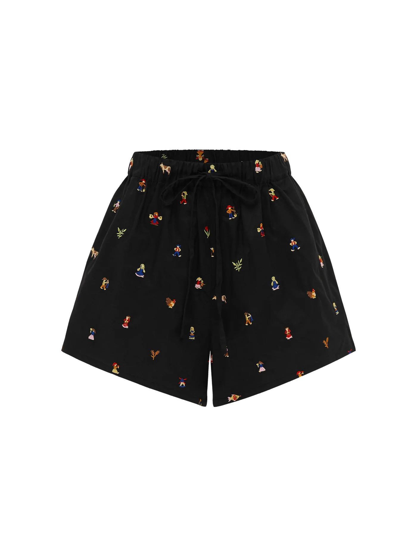 ‘Fellow’ features 100% organic cotton sateen, meticulously embroidered all-over with charming farm-inspired motifs in vibrant hues on a solid black base, inviting a whimsical touch of countryside camaraderie.