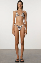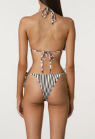 The Paint Flower Reversible Retro Tie Brief offers a versatile fit with a gently curved waistline that can be worn high or low on the hip, depending on your preference. This swimsuit can be worn two ways, one side showcases a hand-painted black floral print, while the reverse reveals a classic black pinstripe.