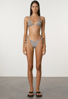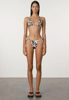 The Paint Flower Reversible Triangle features a soft triangle cup with adjustable ties. This versatile swimsuit can be worn two ways—one side showcases a hand-painted floral print, while the reverse reveals a classic black pinstripe.