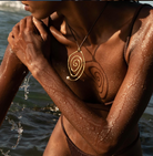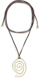 A playful exploration of shape and movement, our Spiral wrap is a lightweight wrap showcasing a brown leather cord paired with an 18k gold plated spiral pendant