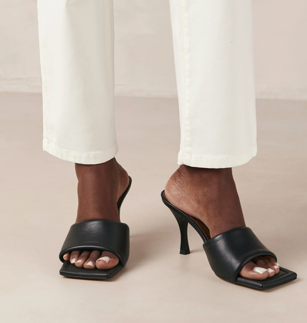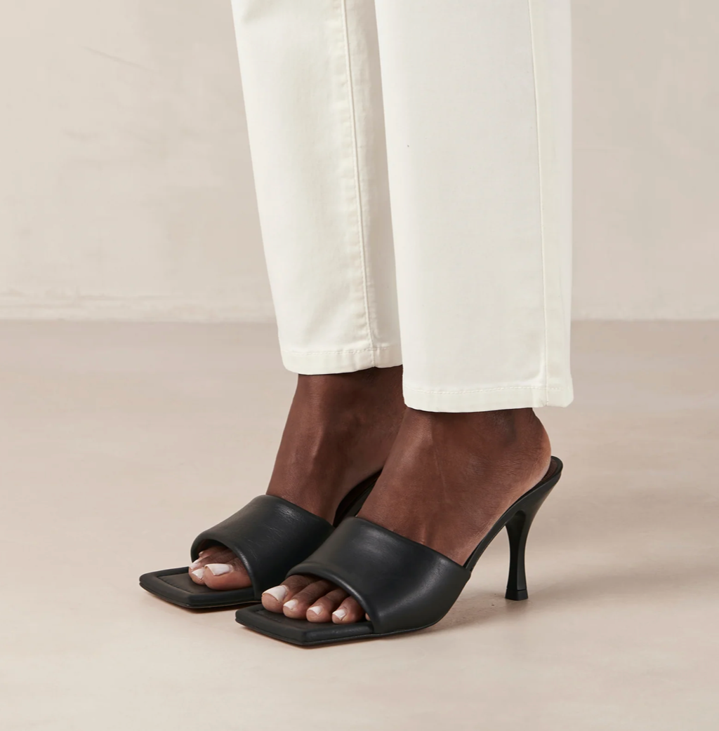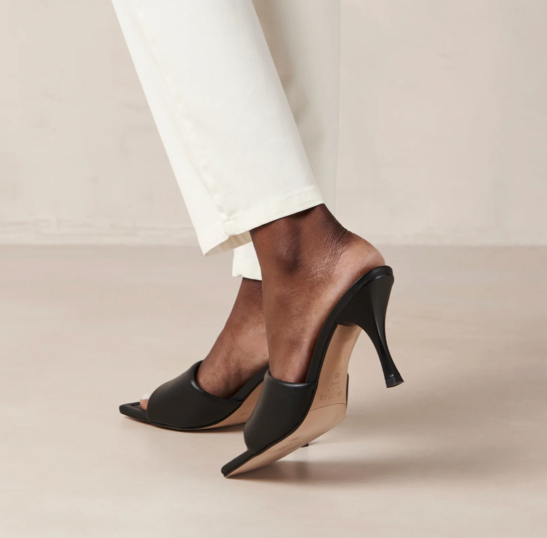 These black leather mules from Alohas are the perfect addition to any woman's wardrobe. The slip-on design and comfortable block heel make them perfect for any occasion, while the high-quality tafetan fabric ensures lasting wear. Whether you're dressing up for a special event or simply want to elevate your everyday style, these chic black leather mules are a must-have!