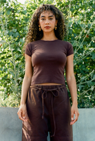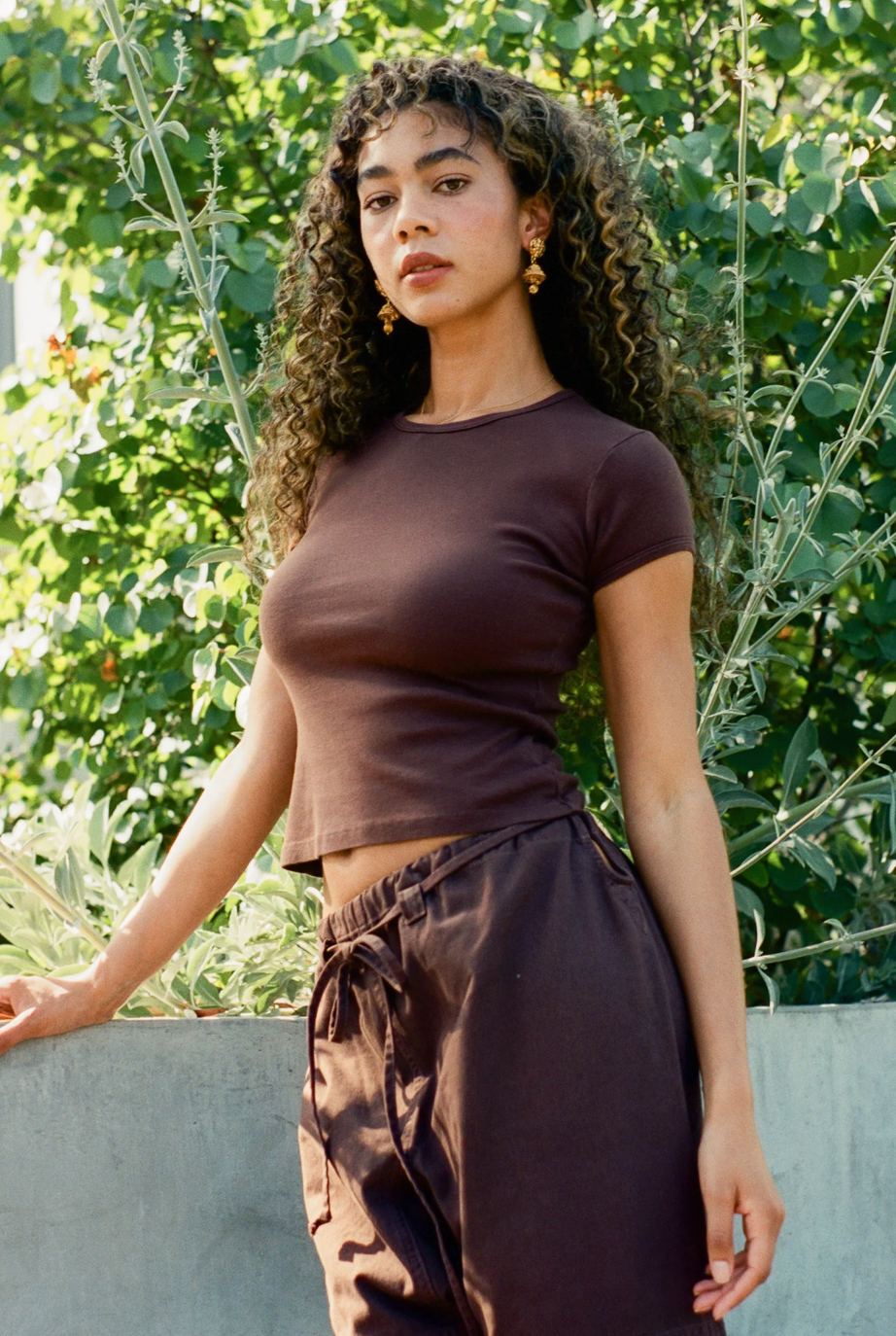 A super soft short-sleeve baby tee made from cotton baby rib. Flattering and form-fitting, it’s the perfect length to tuck into a high waist, or not. Made in USA with locally knit materials.