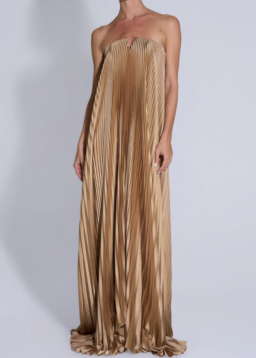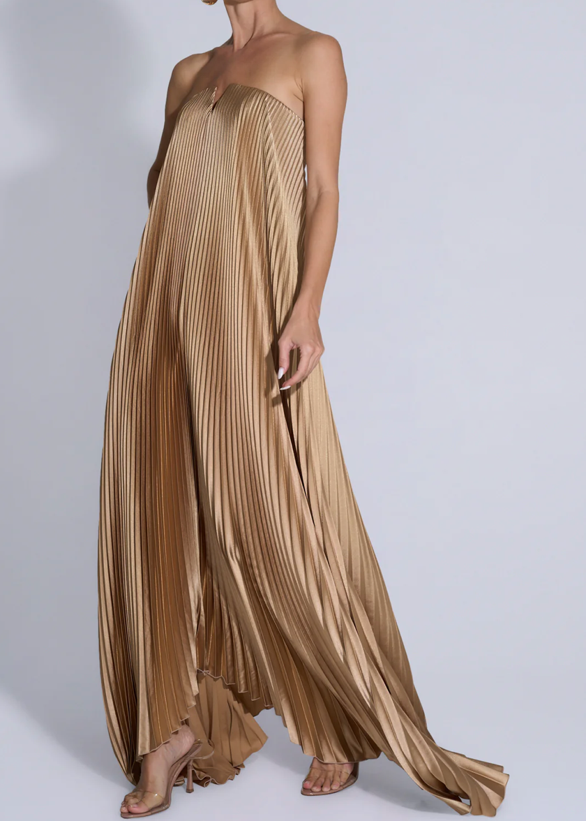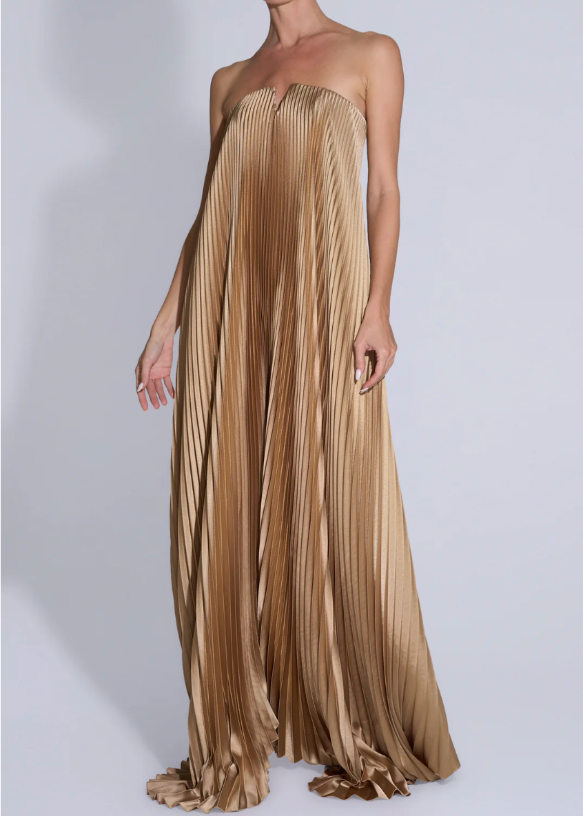 A silhouette that will stand the test of time, featuring a timeless strapless neckline and v detail. The long line billowing silhouette will move with finesse as you motion through your next soirée.