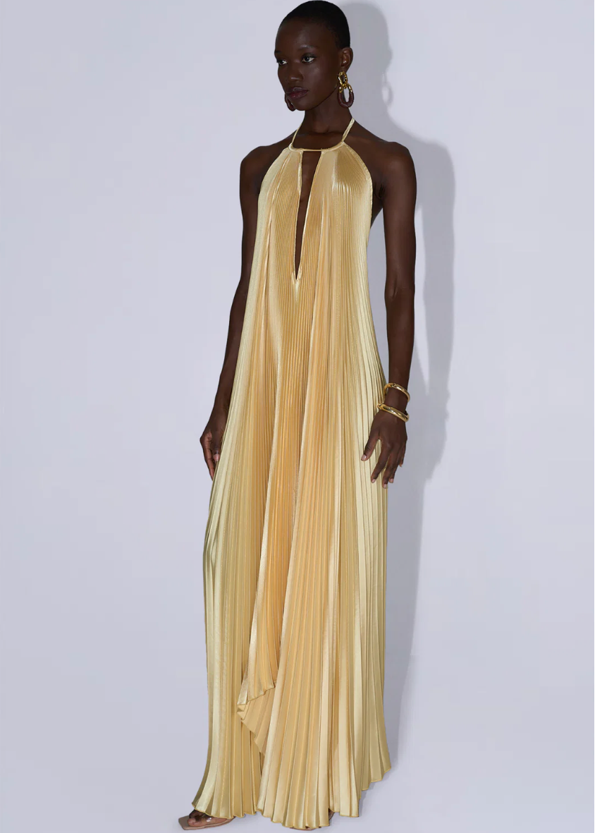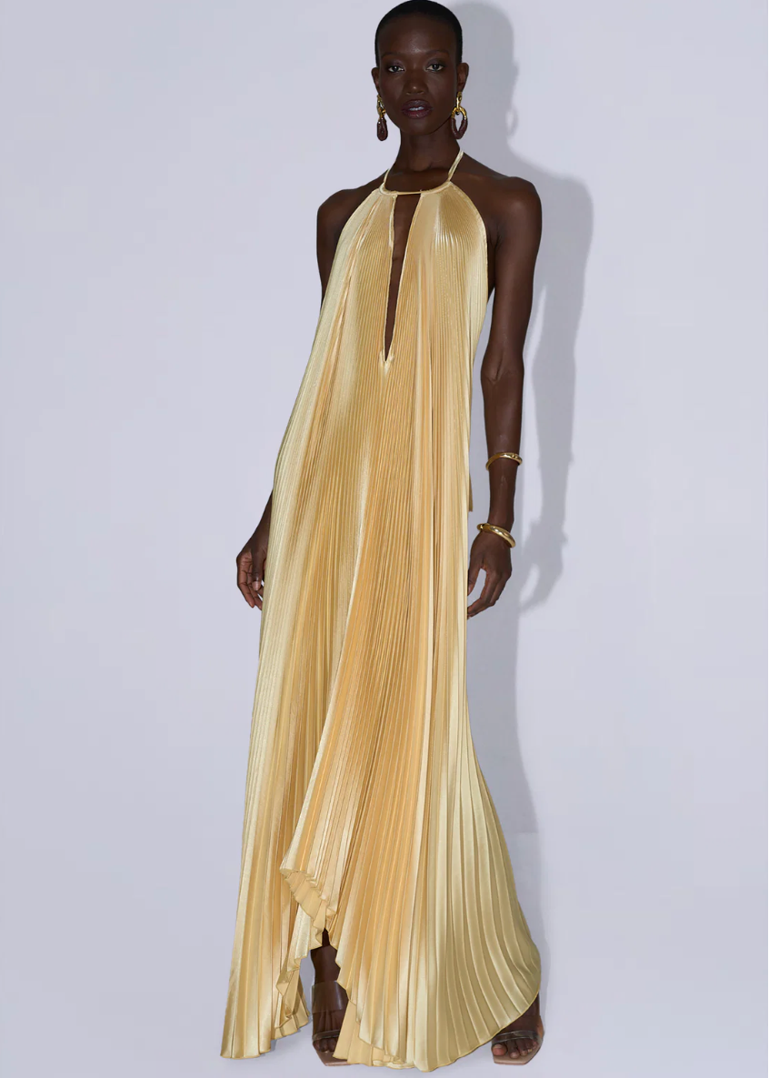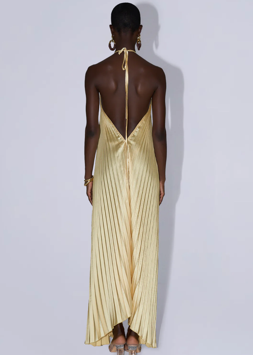 Featuring an elegant open back, halter neckline, asymmetrical silhouette, this opulent pleated full-length silhouette will make your evening unforgettable.