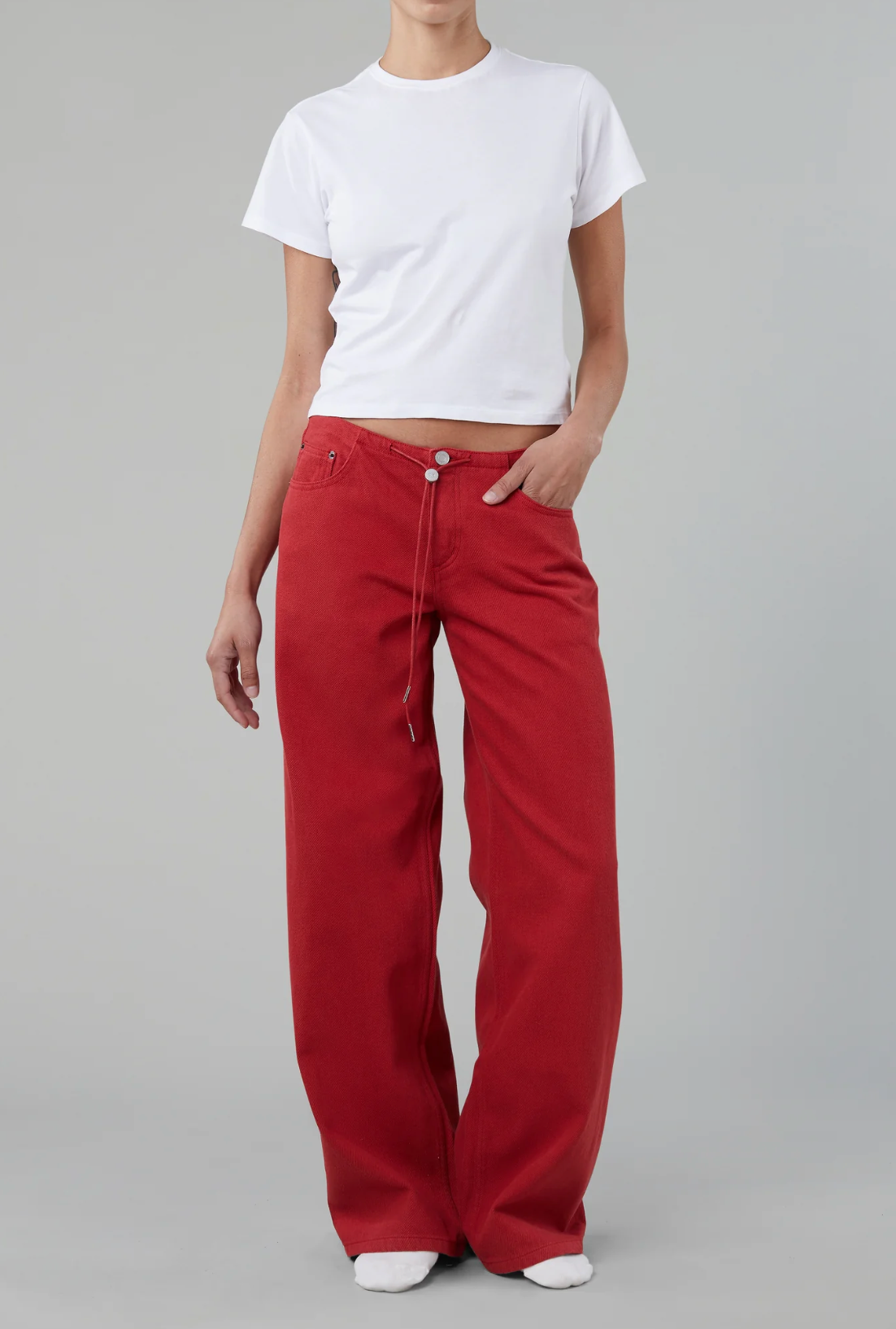 The Cool jean is a relaxed leg, low-rise jean with an adjustable drawstring toggle. The Cool has no waistband (yes, no waistband.) It features a traditional button fly, custom hardware and our signature 'SH' embroidery.