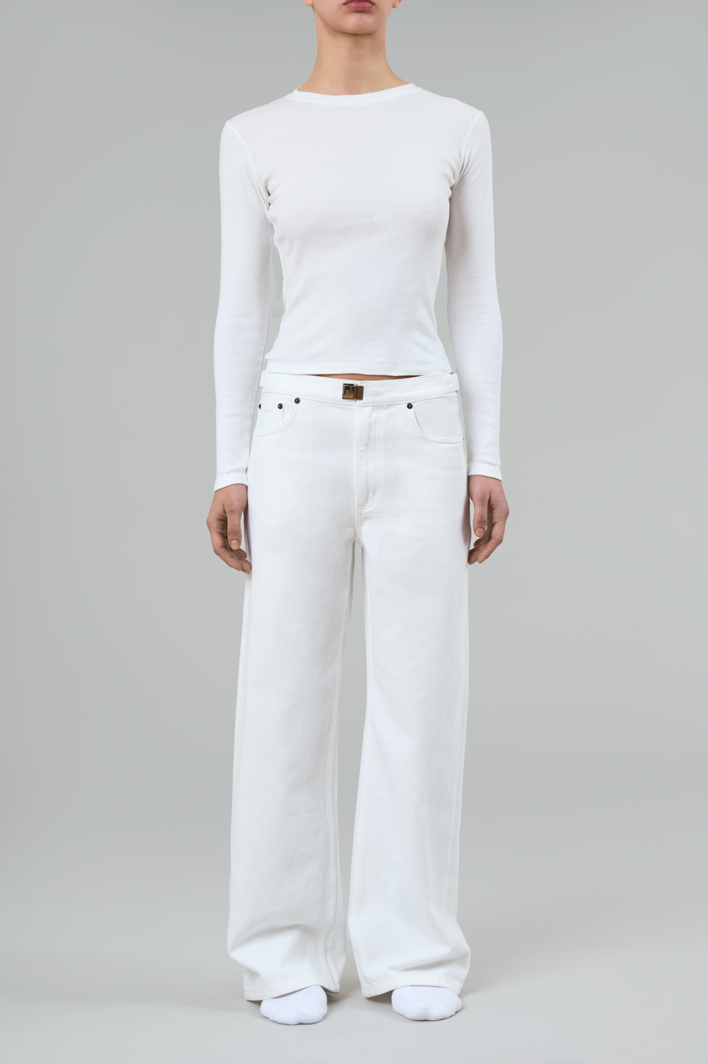 The Buckle jean is a relaxed leg, subtle drop-crotch with a 31" inseam. It features our custom chrome buckle hardware and adjustable waistband side fasteners, allowing it to be worn as both a mid or low-rise jean.