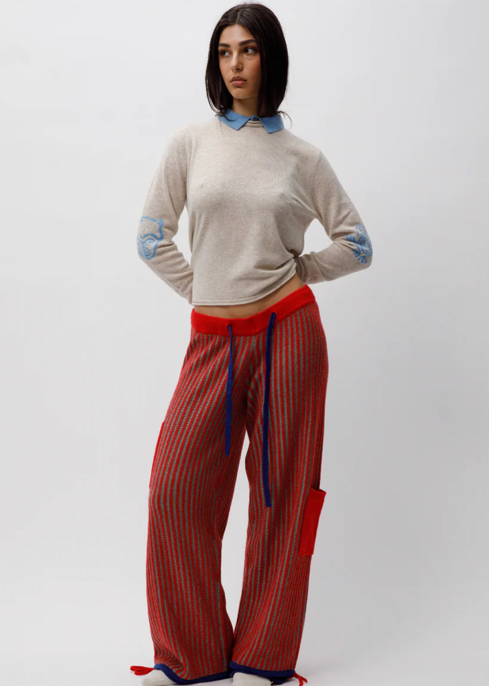 Made from ribbed cashmere, these trackies are designed for a unisex fit according to men's sizing. For a less oversized fit, women should order a size down. All details and designs are hand drawn by Adrian Schachter. Model is wearing a size medium.