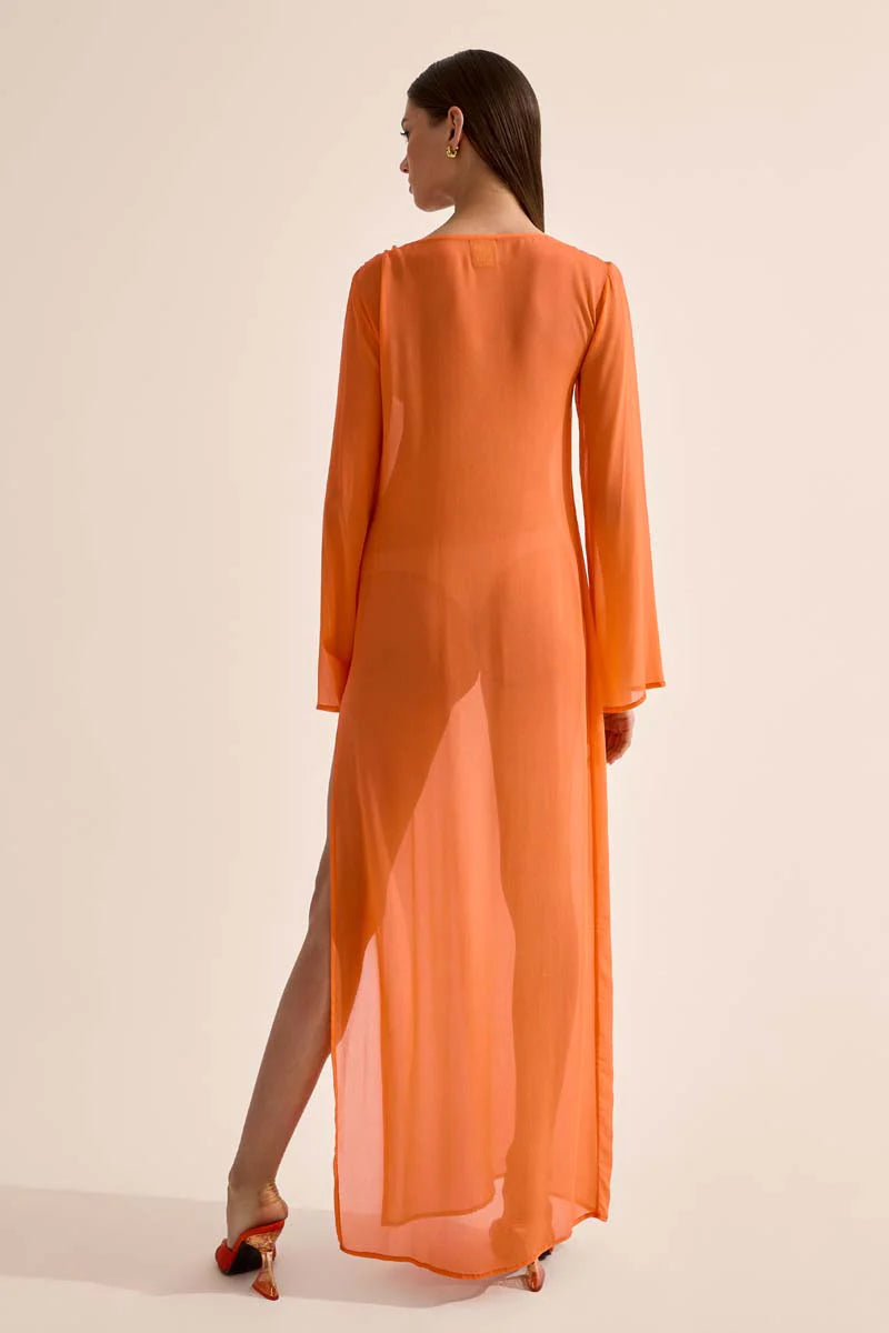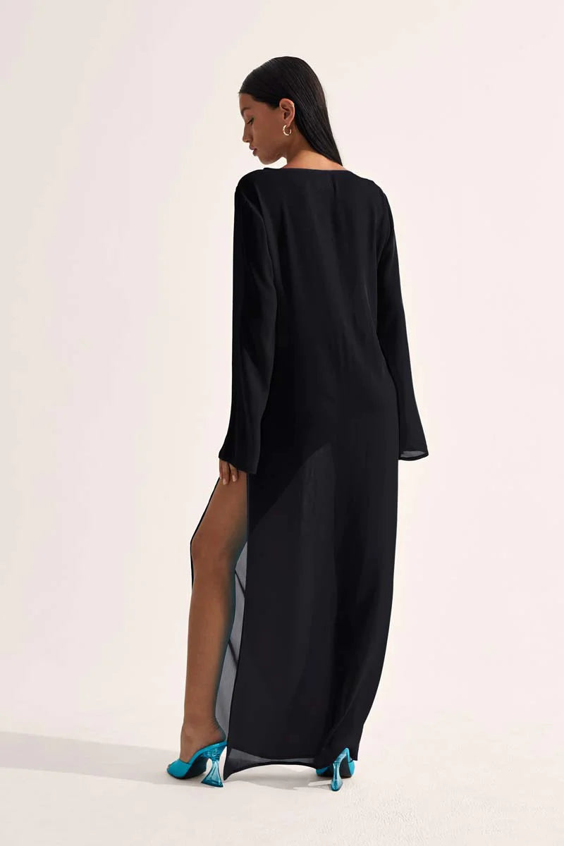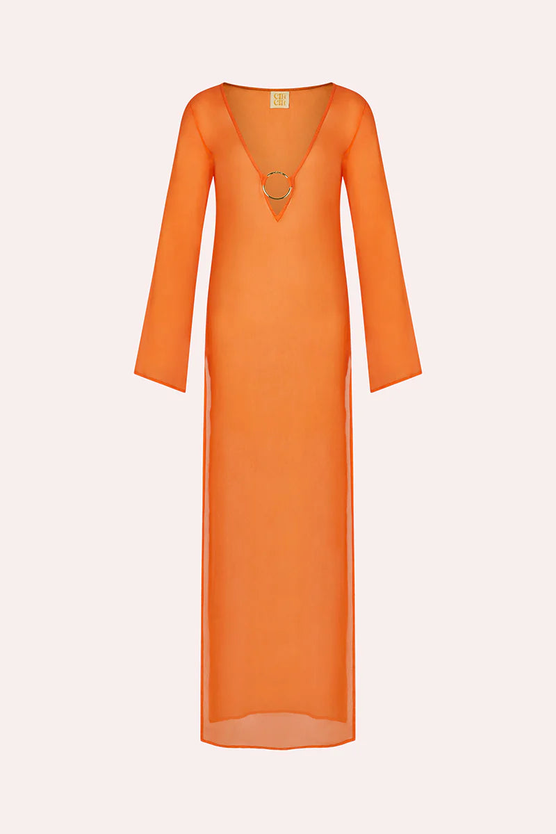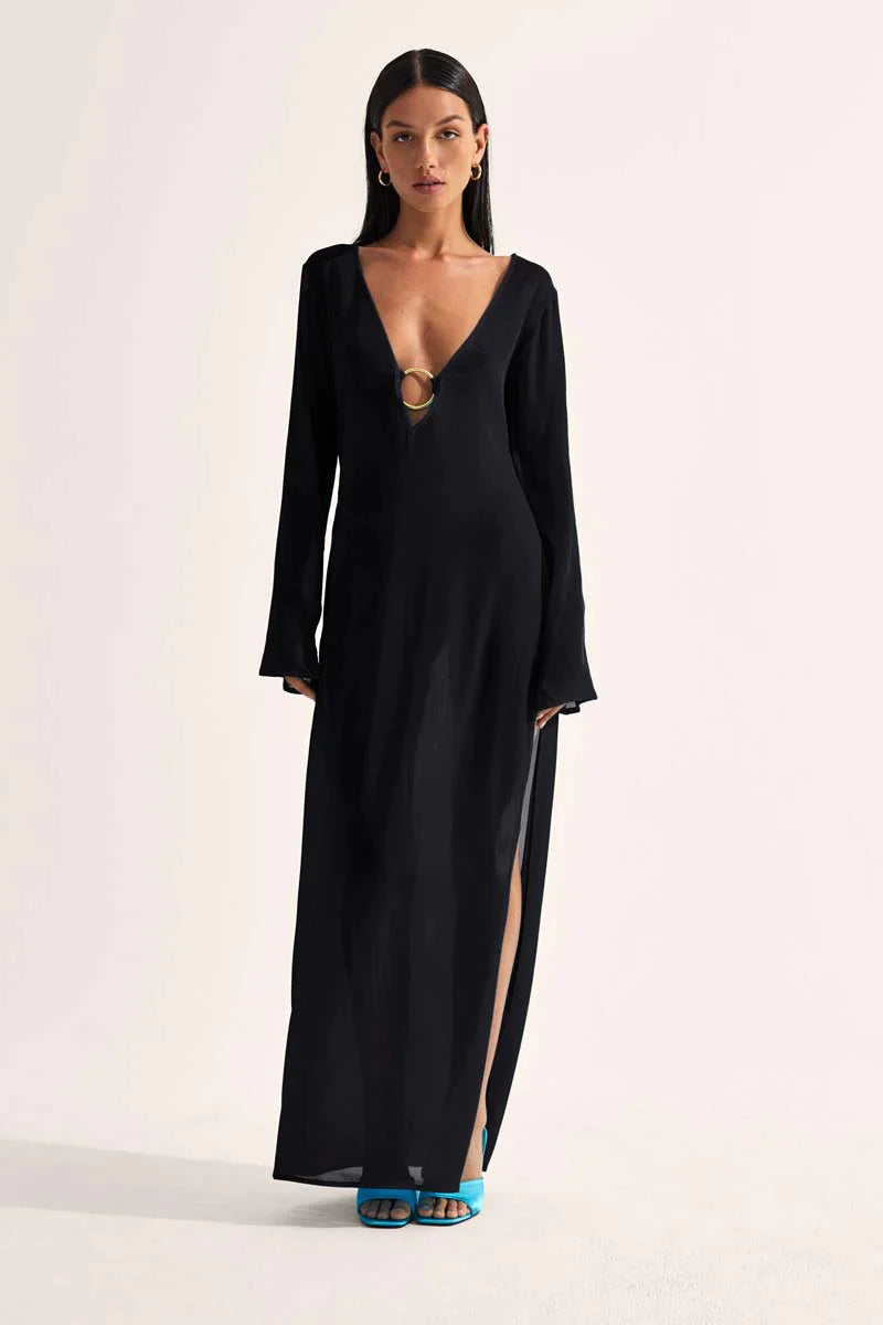 The Totem Hoop Maxi Dress dress is a lightweight, non-stretch weave dress with a floral print. It features a deep V neckline with O-ring detail, long sleeves, thigh-high slit at side, and semi-sheer fabric. It is imported from Indonesia and hand wash is recommended.