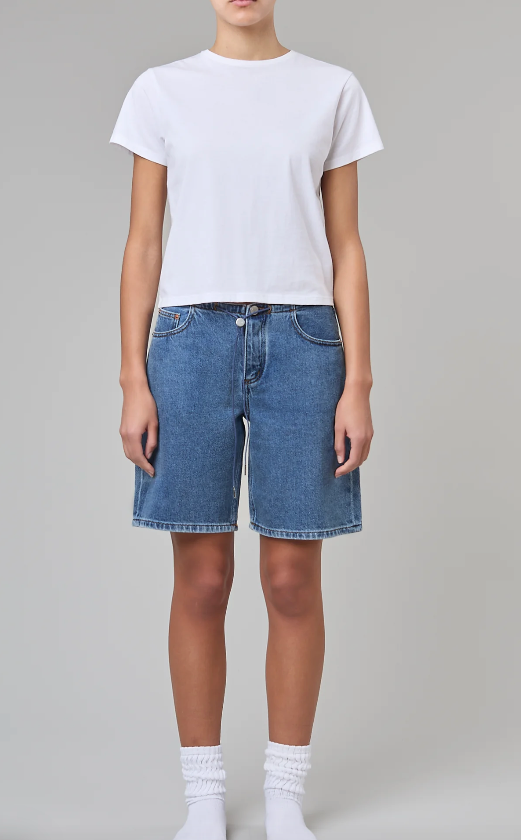 The Cool Shorts are inspired by our best-selling Cool Jean style. They are a relaxed leg, low-rise jean short with an adjustable drawstring toggle. The Cool Shorts have no waistband just like our original Cool jean style. They are designed to hit just above the knee and feature a traditional button fly, custom hardware, and our signature 'SH' embroidery.
