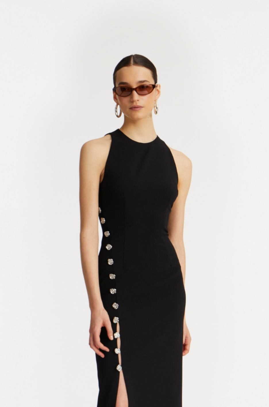 CREPE BUTTON DRESS BLACK FEATURES A STREAMLINED SILHOUETTE WITH A CONCEALED BACK ZIPPER. THE HEMLINE FALLS TO A MID-LENGTH AND MAINTAINS A STRUCTURED FINISH.