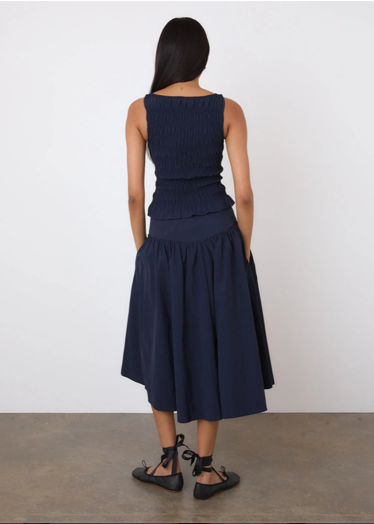 The Deba Midi Skirt is a modern twist on the classic half-circle skirt, featuring a mid-rise, deep V-shaped waistband, an invisible front zip and newly featured pockets. Made from signature nylon, it has a gathered, A-line silhouette that gives a flowy, flattering fit. For a matching set, pair it with The Deba Top in Midnight.