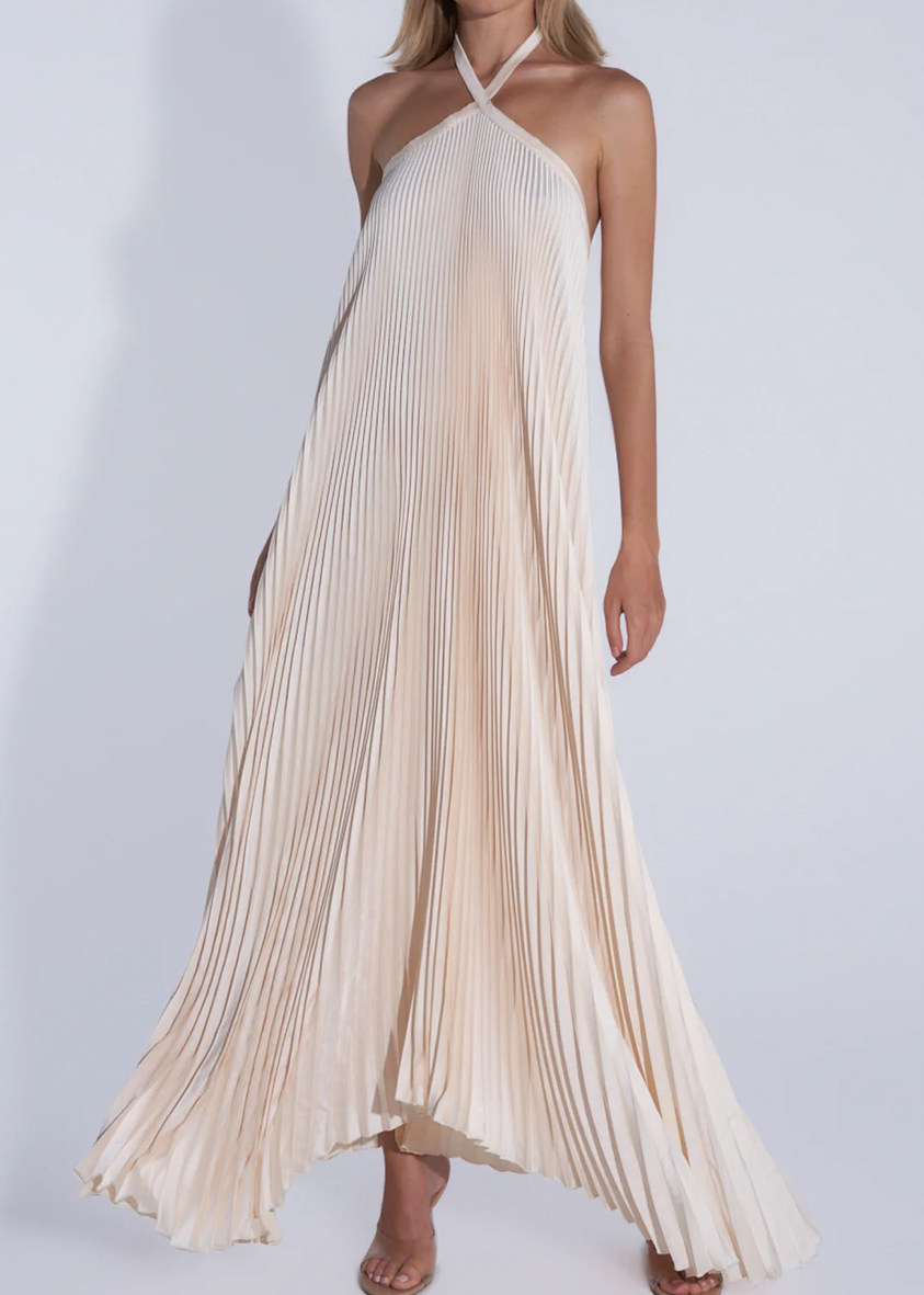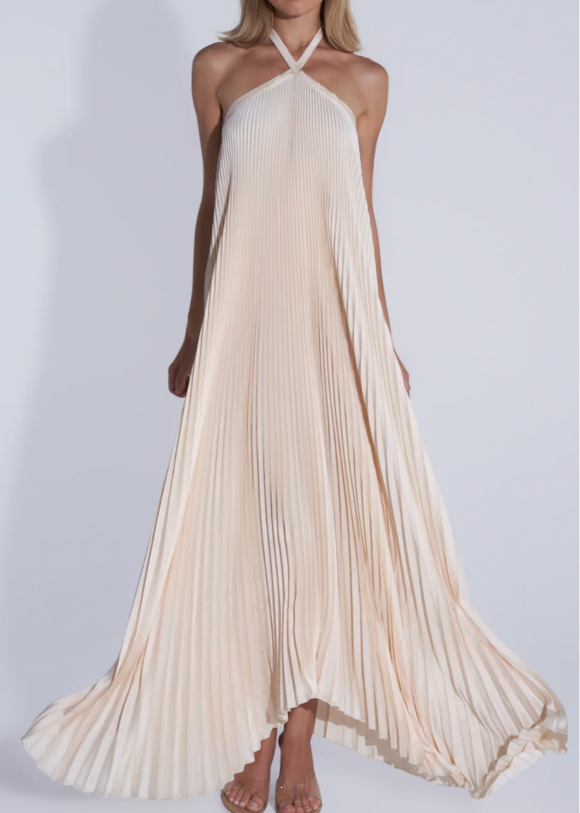 Crafted with elegance and grandiosity in mind. The theatrical pleats are elevated by the length of the gown, creating an exquisite silhouette that will move with finesse. Featuring a delicate halter neckline, contemporary inverted hemline, and finished with open back. A striking gown with an unwavering air of opulence.