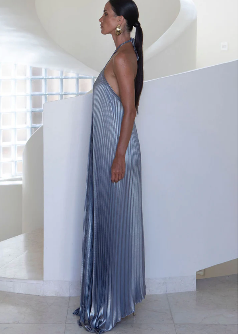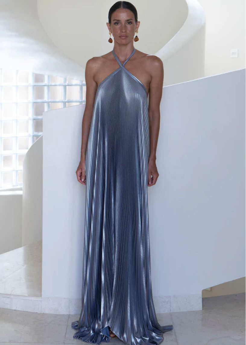 Crafted with elegance and grandiosity in mind. The theatrical pleats are elevated by the length of the gown, creating an exquisite silhouette that will move with finesse. Featuring a delicate halter neckline, contemporary inverted hemline, and finished with open back. A striking gown with an unwavering air of opulence.