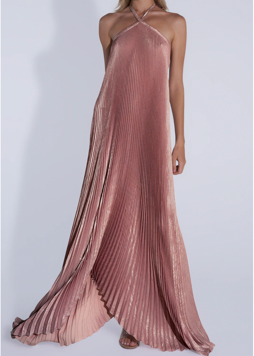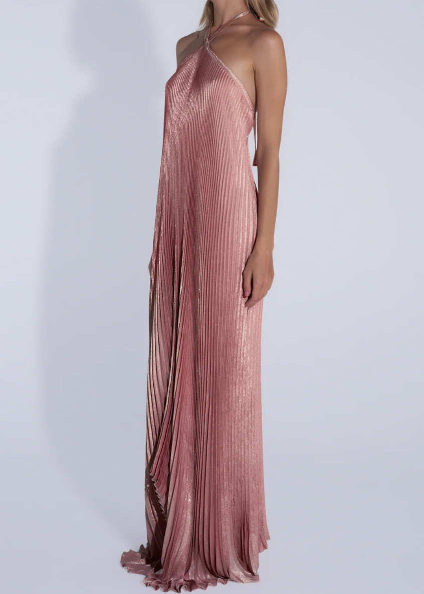 Crafted with elegance and grandiosity in mind. The theatrical pleats are elevated by the length of the gown, creating an exquisite silhouette that will move with finesse. Featuring a delicate halter neckline, contemporary inverted hemline, and finished with open back. A striking gown with an unwavering air of opulence.