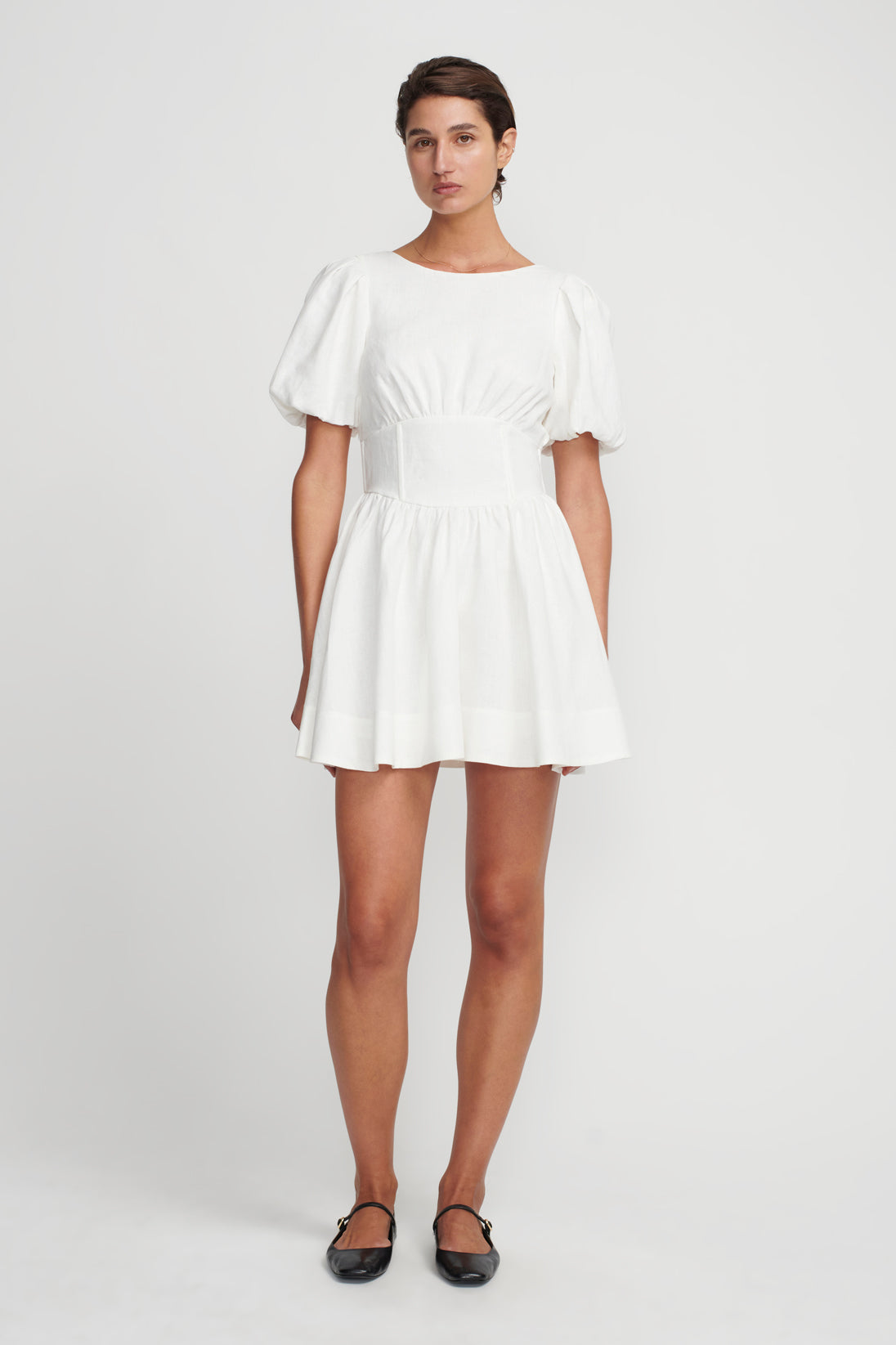 The Harmony Dress is our stunning open back mini dress. Features include a boat neckline, bodice waist panel and a full hemline finished with a gold beaded trim. The puff sleeves and heavily gathered skirt are balanced out by the low back design and delicate tie detail. Pair back with your favourite heels for a fun and flirty look.