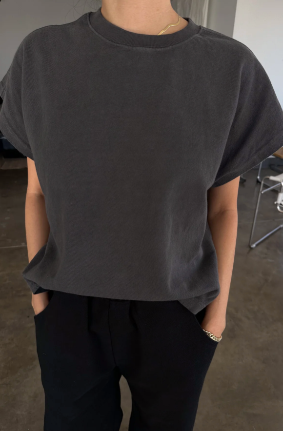Jeanne Tee is our perfect muscle tee. She features a shorter length to pair perfectly with high waisted bottoms but still give enough coverage for mid-rise bottoms and just the right amount of off shoulder dolman sleeve. She has a high crew neck with an extra wide neckband that adds to her signature charm.