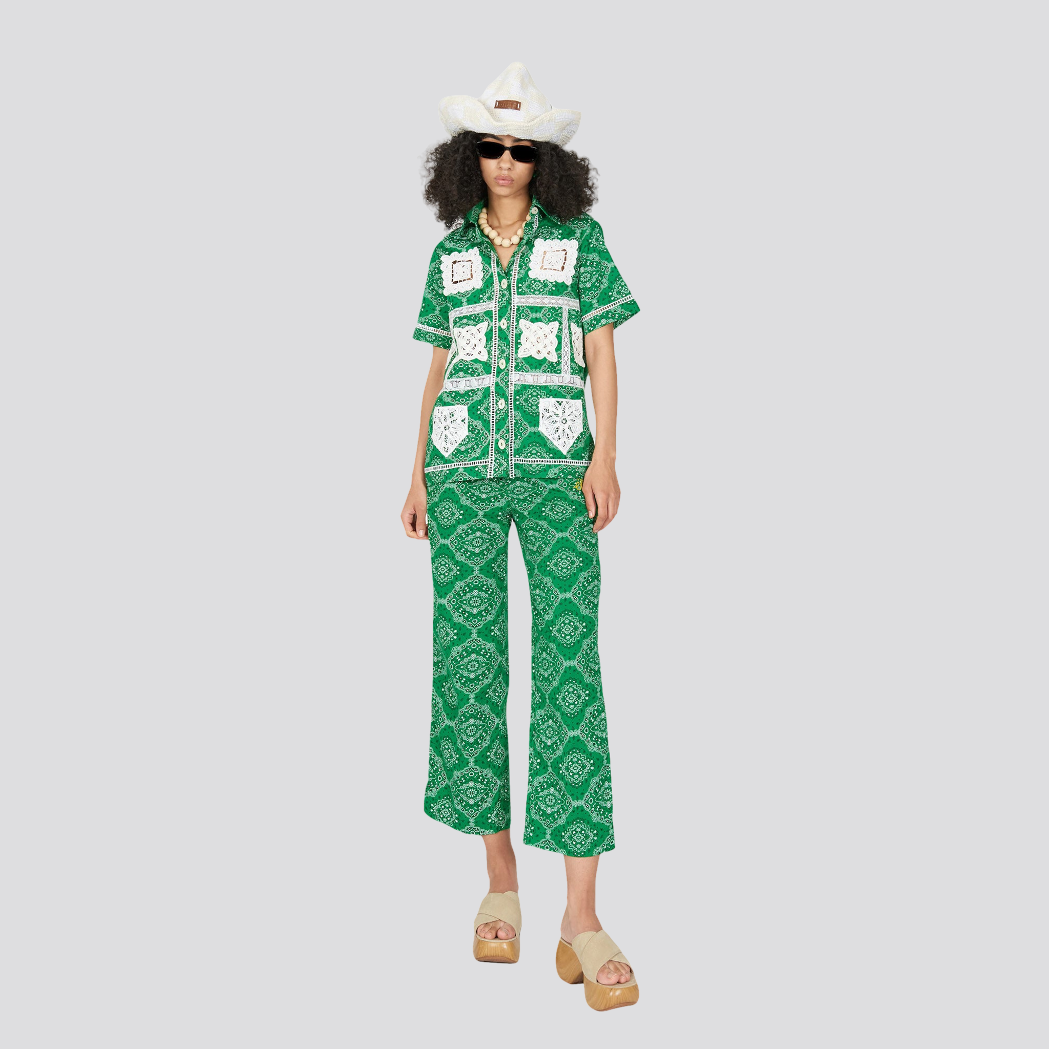 The Joao Patchwork Shirt from is a one-of-a-kind piece that is handmade with love in Brazil. This shirt is made with deadstock yellow bandana fabric and features hand-made appliques called 'renda rensensa,' a technique originating in Fortaleza, Brazil. Every delicate applique is carefully hand-placed and sewn onto the shirt by Tia Zezeca, one of our co-founders' aunts. Zezeca's work serves as a reminder that love for family and artisanal skills go hand in hand. When this sentiment is reflected in clothing, each piece should be treasured. This shirt is a limited edition, with only 20 units produced.