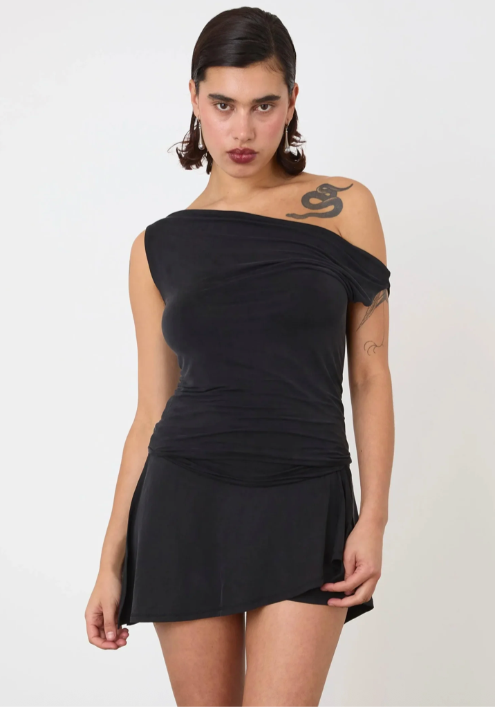 A double layered multi wear top made from cupro fabric. Wear on or off the shoulder. Features a draped cowl neck drape, flattering across a range of chest sizes. Crafted from cupro, a butter soft, semi-sheer and smooth to the touch material made from recycled cotton waste.
