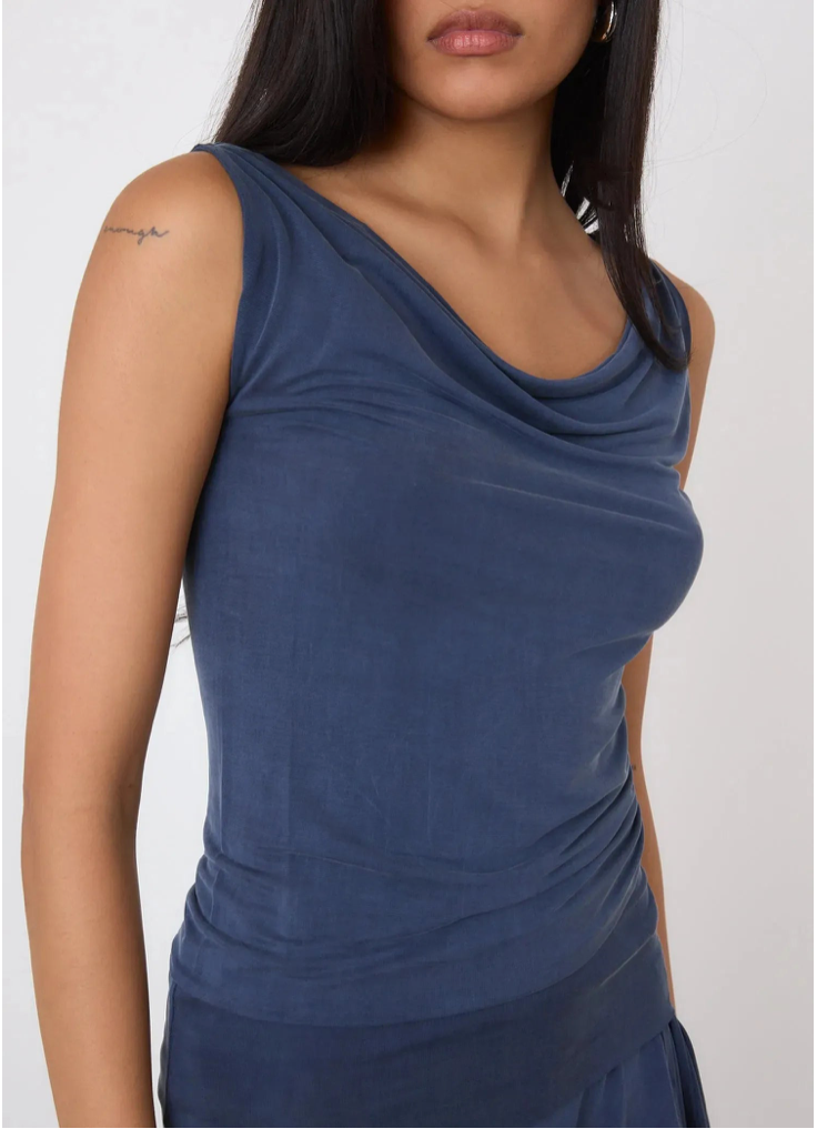 A double layered multi wear top that can be worn on or off the shoulder. Features a draped cowl neck drape, flattering across a range of chest sizes. Crafted from cupro, a butter soft, semi-sheer and smooth to the touch material made from recycled cotton waste.