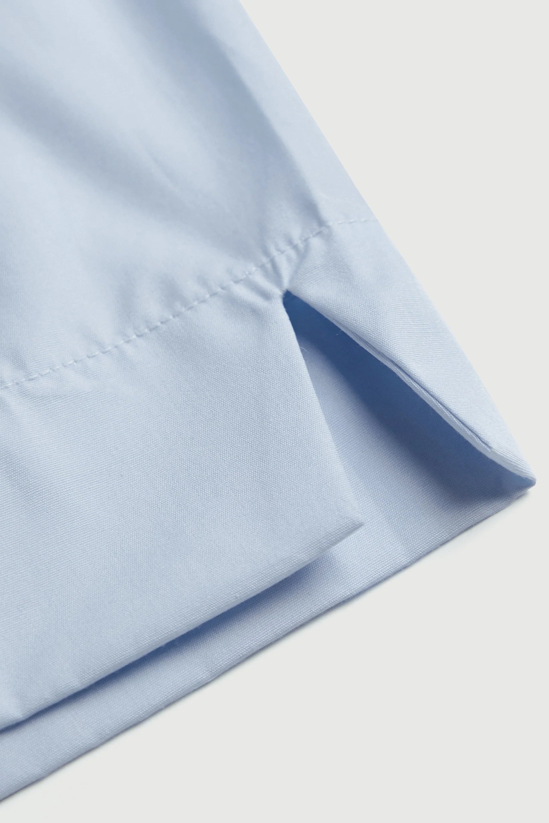 100% Italian Cotton Poplin. Center back seam. Enclosed front flap with working buttons. Seamless sides with slits for relaxed fit. Covered elastic band. Made in Canada.