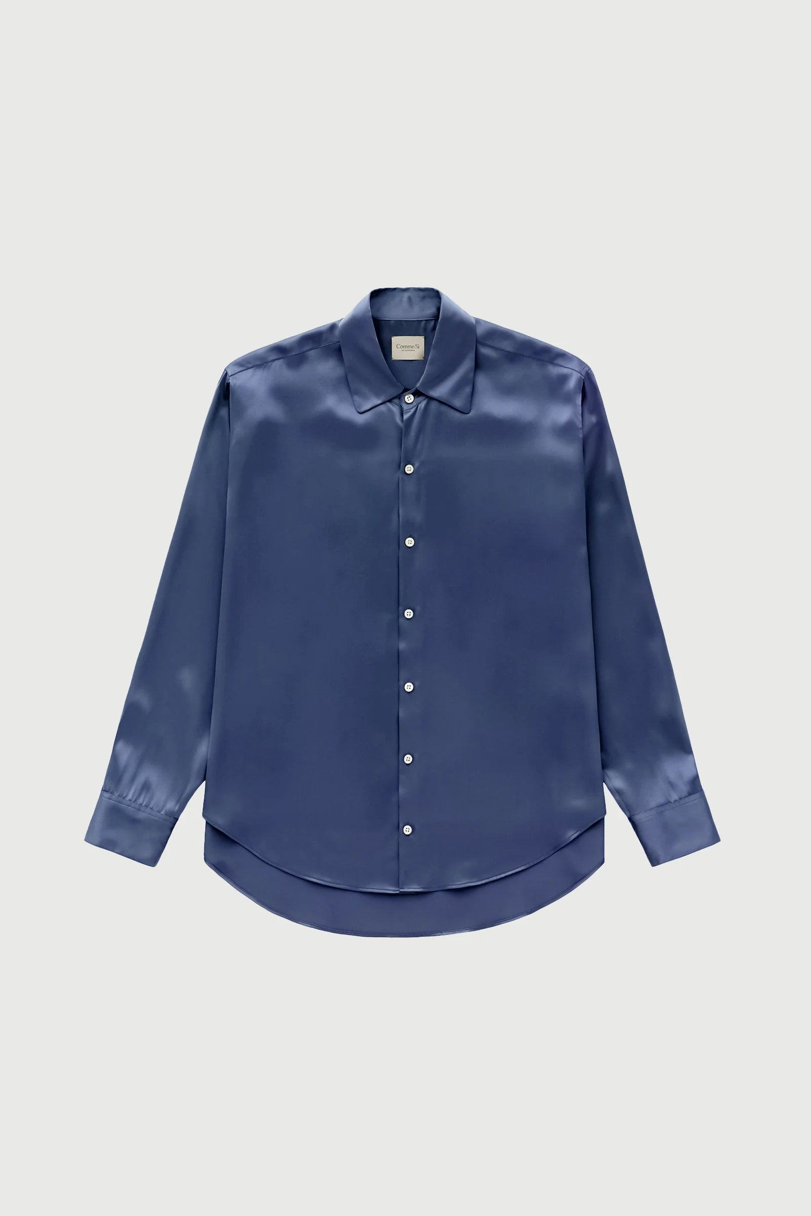 100% Silk. OEKO-TEX certified. Mother of pearl buttons on placket and cuffs. Back yoke with box pleat. Cut in a relaxed shape with wide body. Sized for unisex fit. Made in Italy.