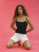 A cotton baby rib spaghetti tank with square neckline. Form fitting and flattering, it’s the perfect length to tuck into a high waist, or not. Made in USA with locally sourced materials.