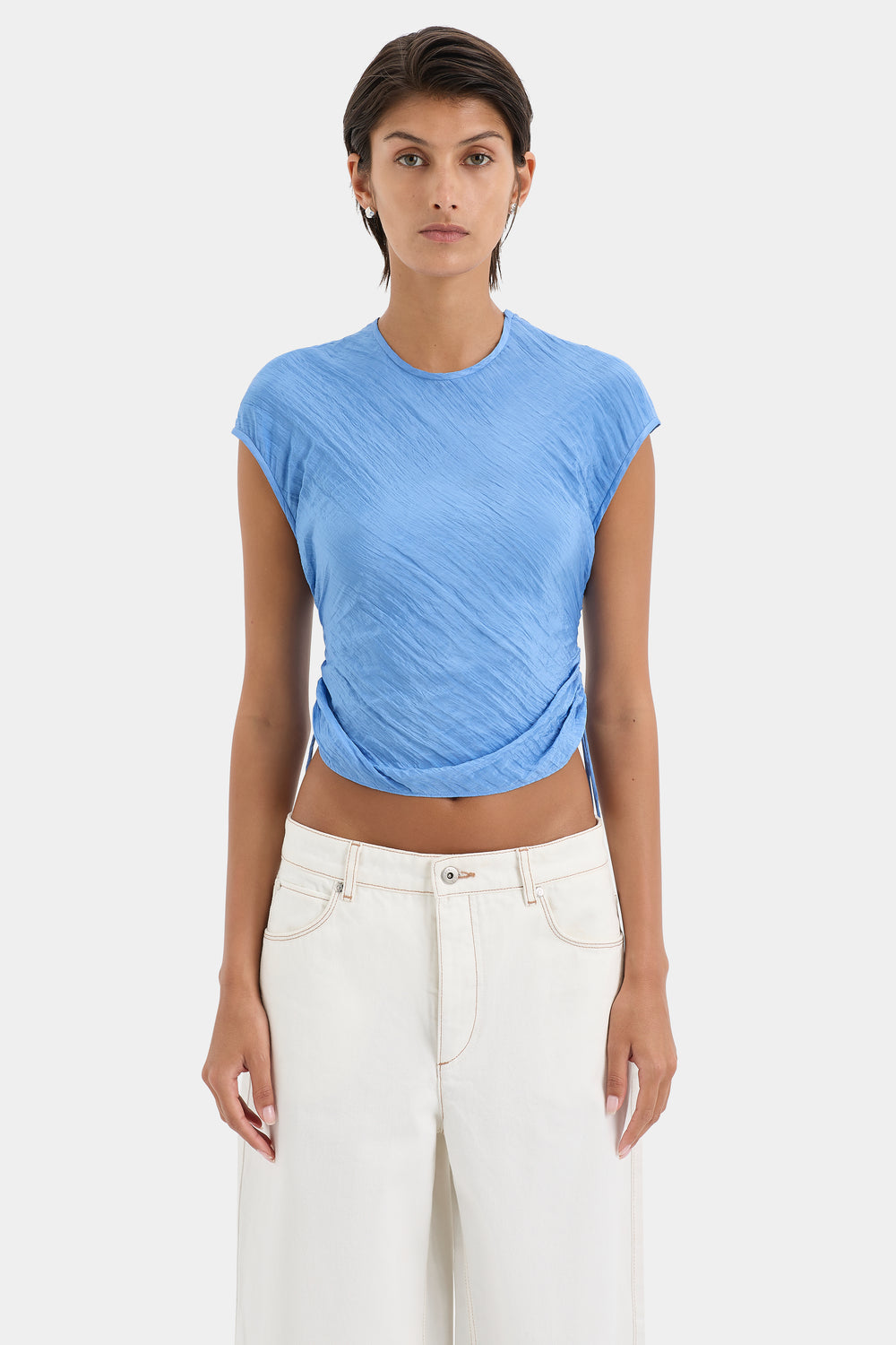 The Ligera Gathered Top in Cornflower Blue is crafted from lightweight crinkle satin with a lustrous finish. Designed for a relaxed fit, it features a round neck, short cap sleeves and adjustable gathering at the sides with drawstring ties.