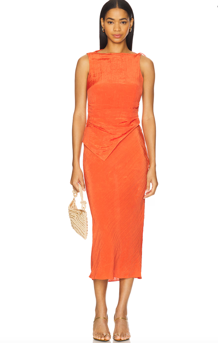 The Ligera Open Back Top in tangerine is a sleeveless modern silhouette, made from a lightweight satin fabric with a crinkle texture and shiny finish. Featuring an asymmetric neckline and cutout at the back, Finished with ruching through the front waist. Pair back with the Ligera Wrap Midi Skirt for a complete look.