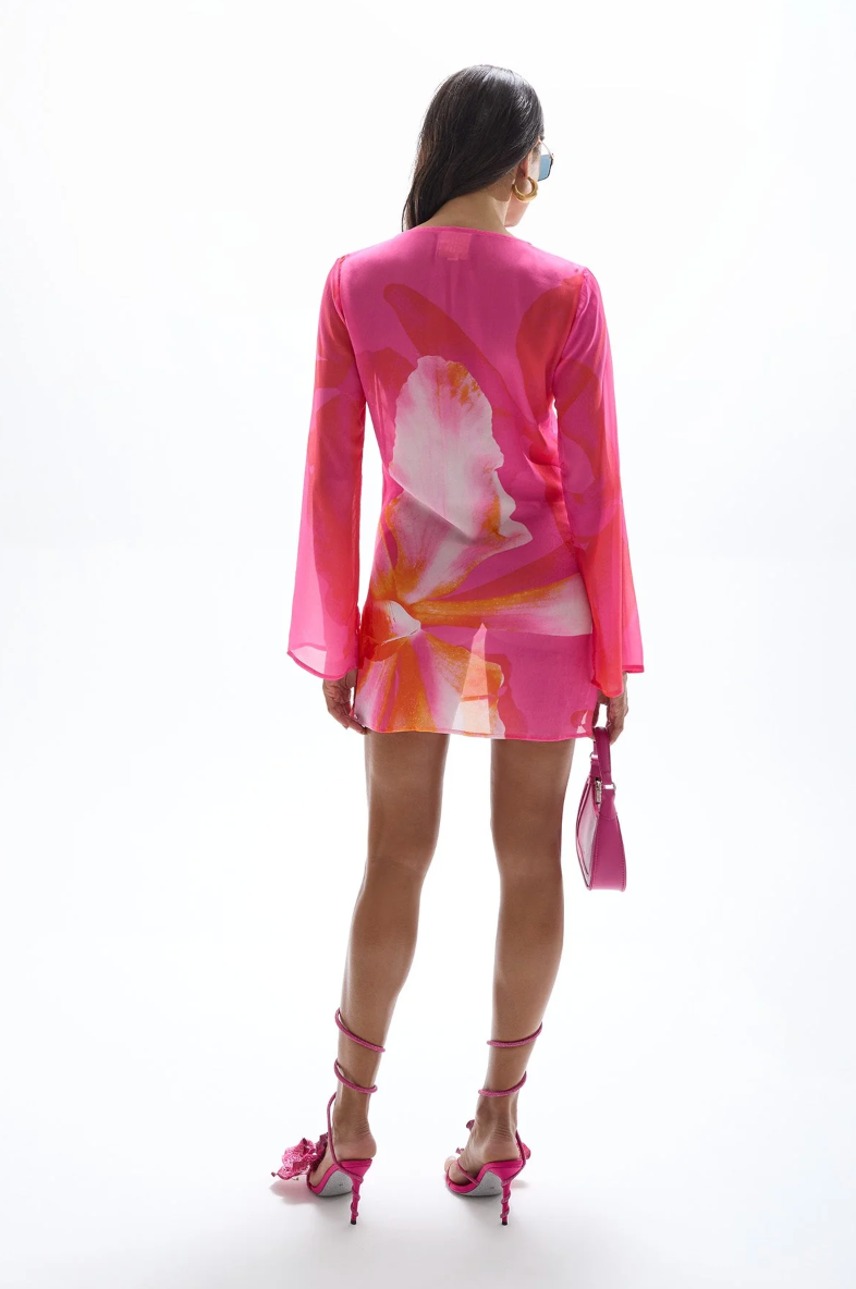 The watercolor inspired canvas of the 'Wildflower' print is doused in electric pink and features the raw beauty of the Orchid flower.