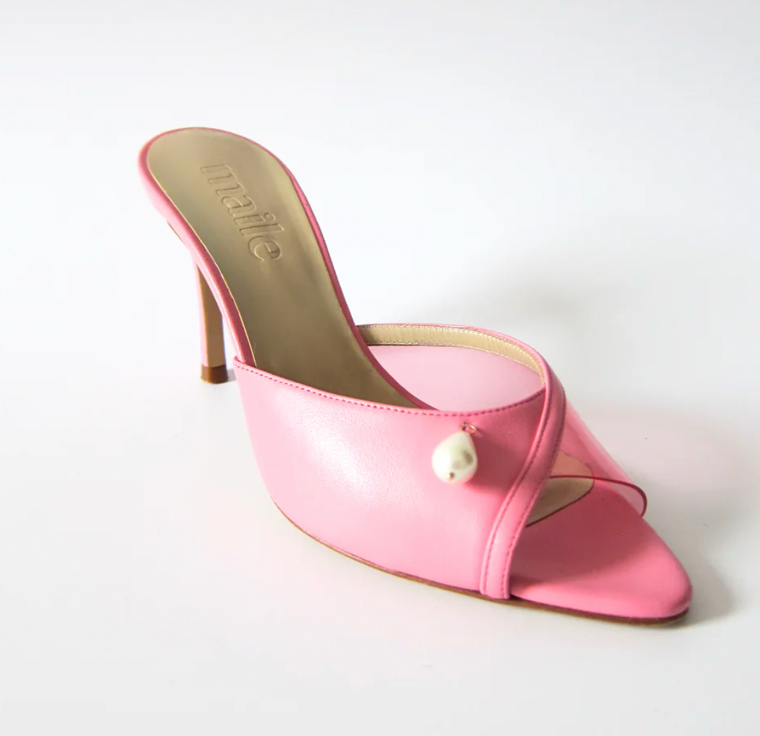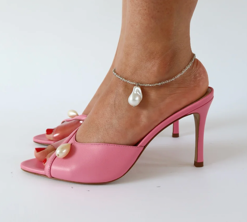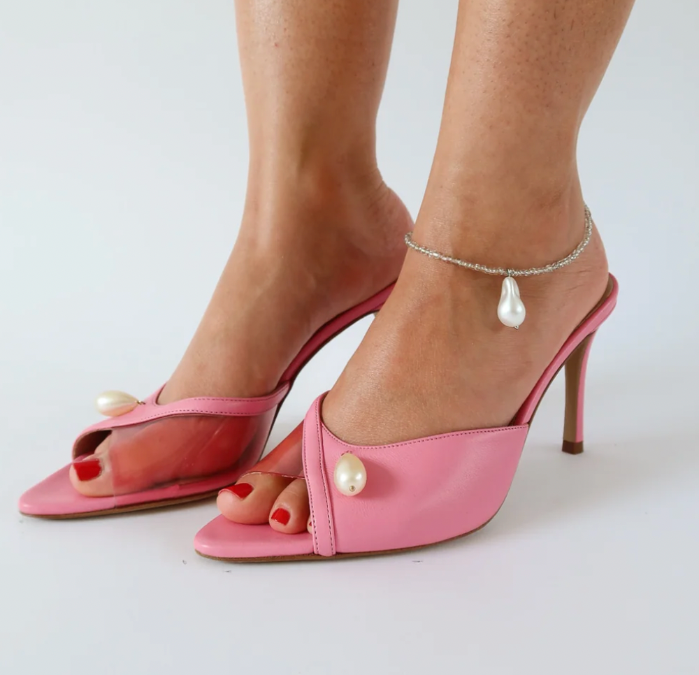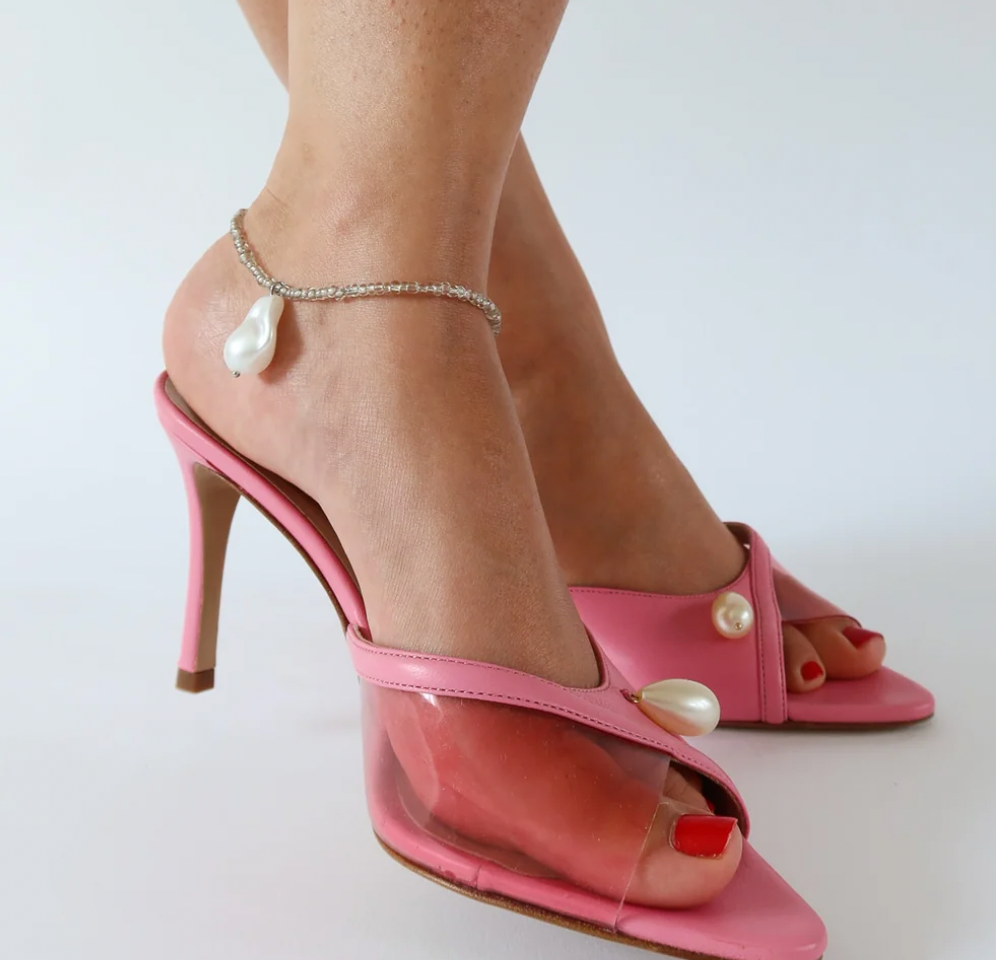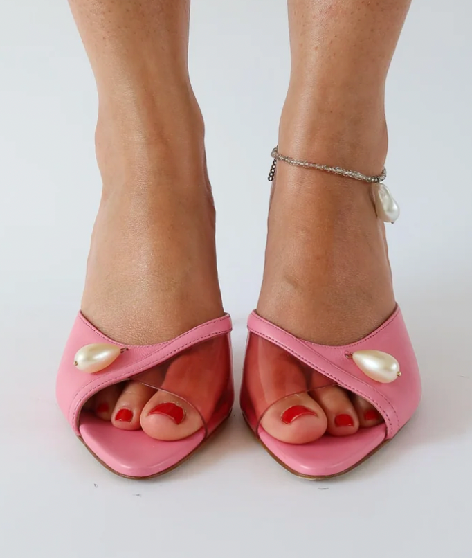 She's smart and fancy. Milly is our summer occasion heel. Timeless elegance with a pierced teardrop pearl and sexy PVC detail.