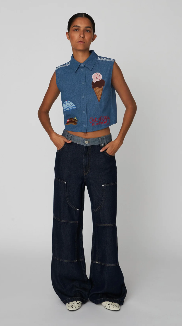 Soft denim vest in a cropped length with button closure and embroidered motifs from the OUT OF OFFICE WARDROBE.