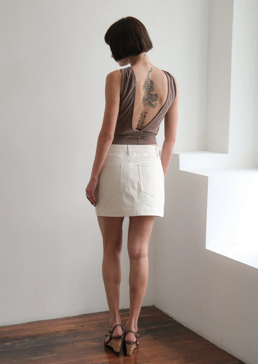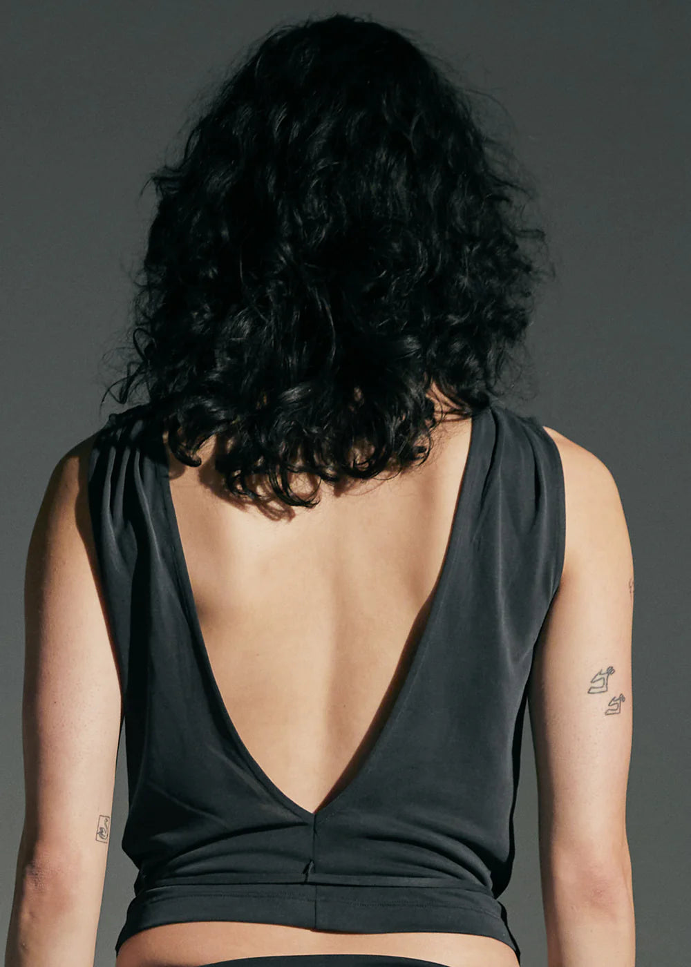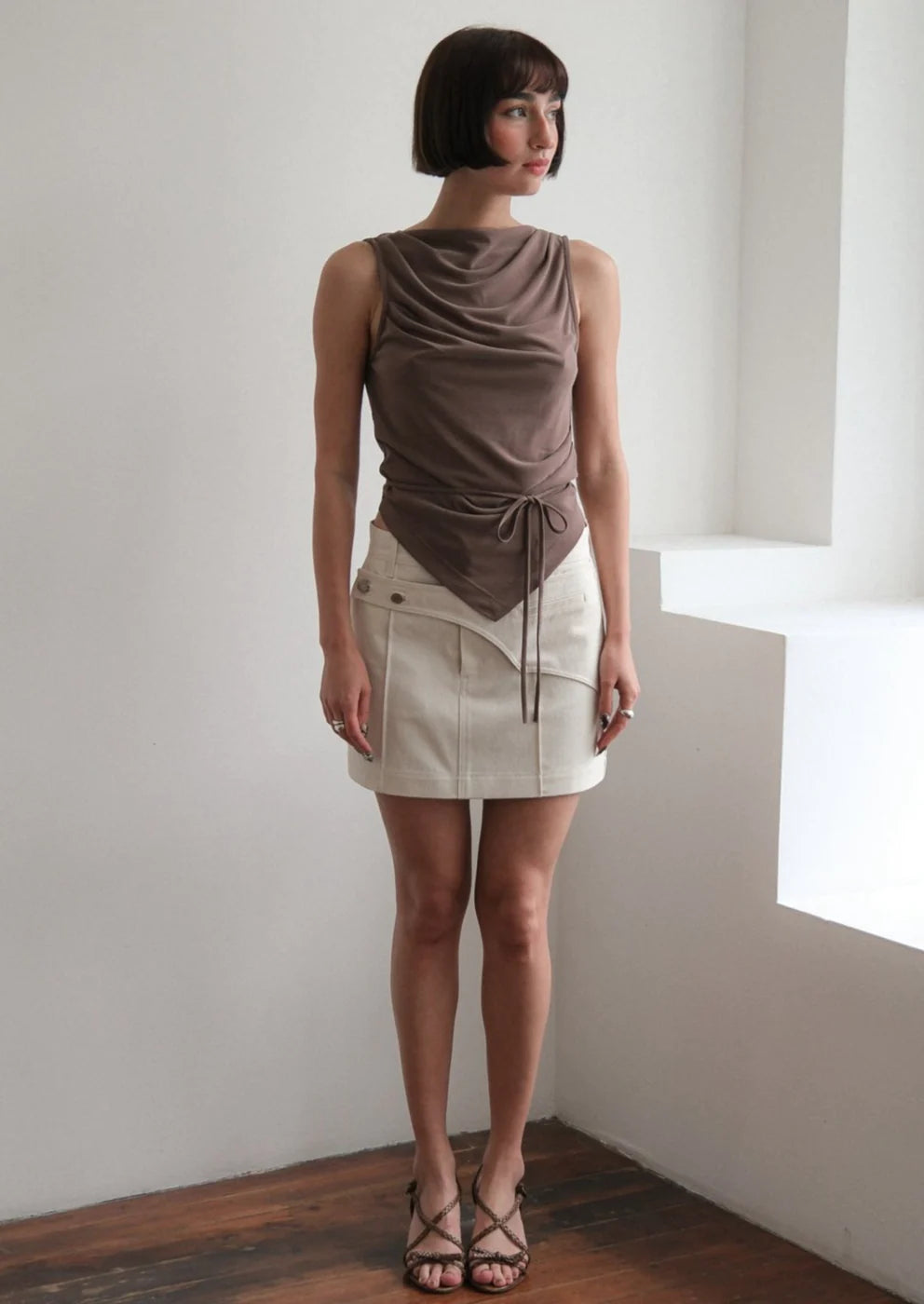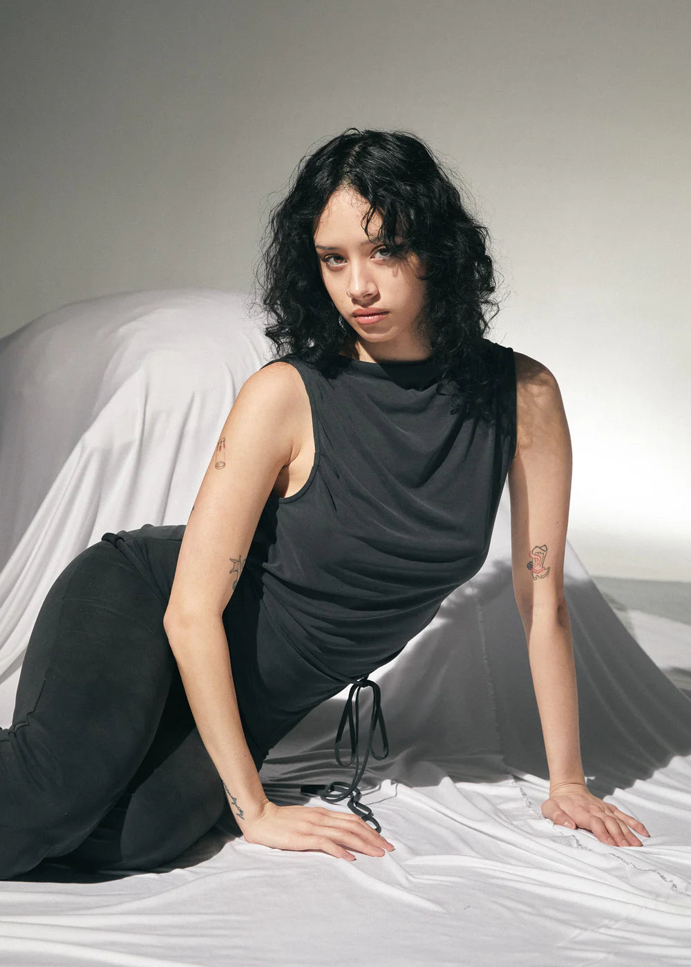 A draped sleeveless top, with an open back and a self tie belt.