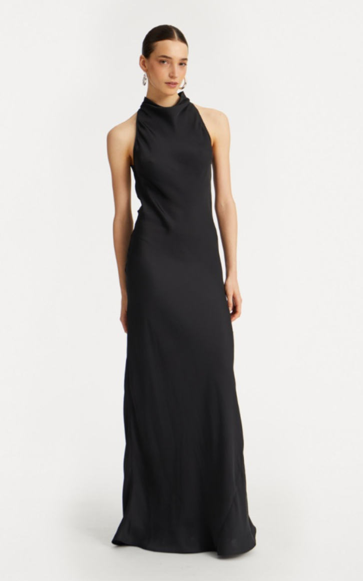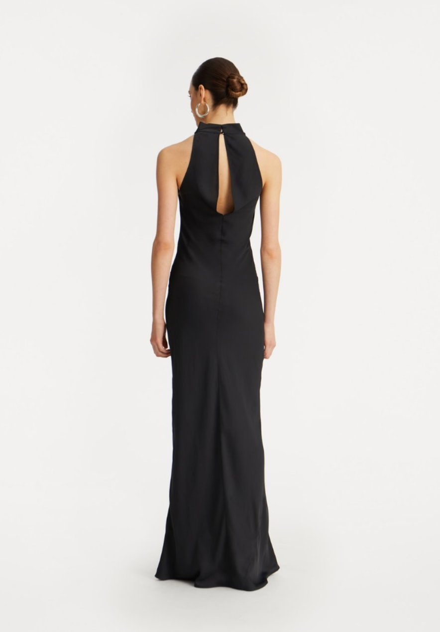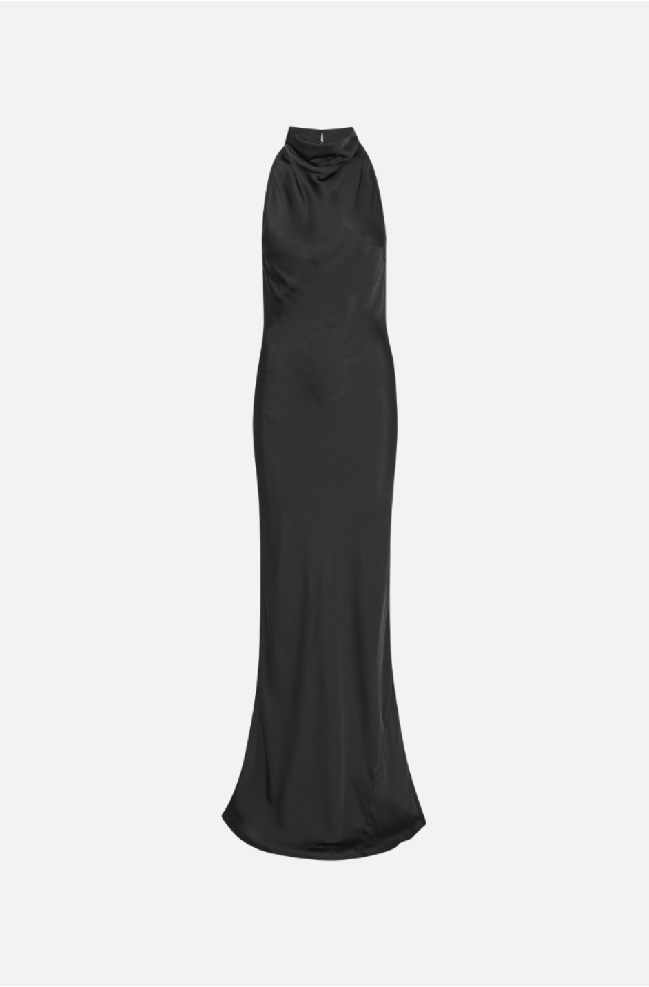 SATIN MAXI DRESS BLACK FEATURES A FLOOR-LENGTH SILHOUETTE WITH A FITTED BODICE AND FLUID SKIRT. DESIGN DETAILS INCLUDE AN OPEN BACK WITH A CONCEALED ZIPPER AND A CLEAN-FINISHED HEMLINE.