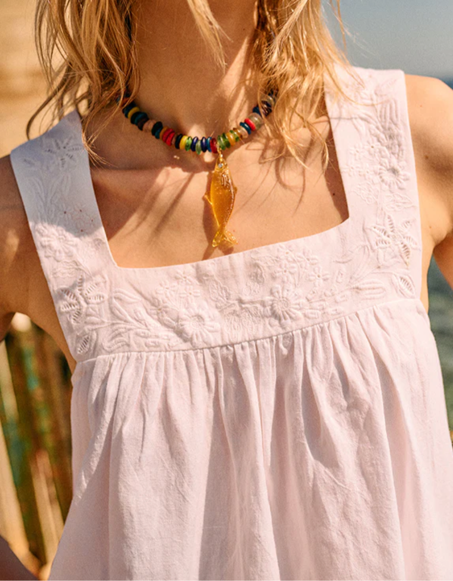 The Serra Dress in white is an airy sleeveless linen mini dress featuring embroidered flowers along the square neckline and straps.