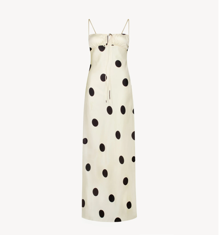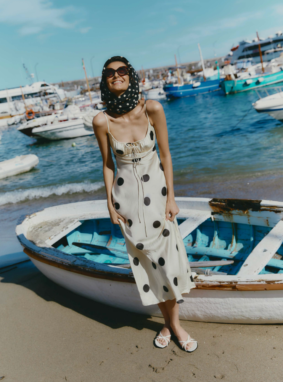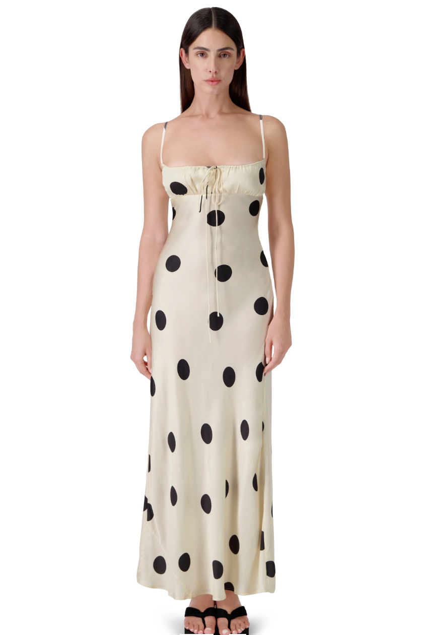 Effortlessly elegant with a playful twist, the Cream Polka Dot Slip Dress features a flattering empire waist, delicate spaghetti straps, and an allover bold polka dot print. Crafted from a silky fabric that glides over the body, it’s the perfect blend of classic charm and modern femininity—ideal for sunny brunches or evening soirées.