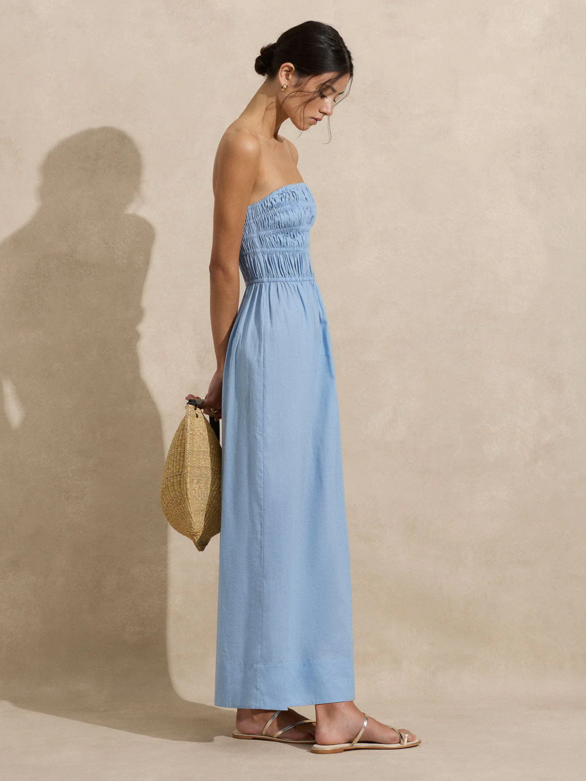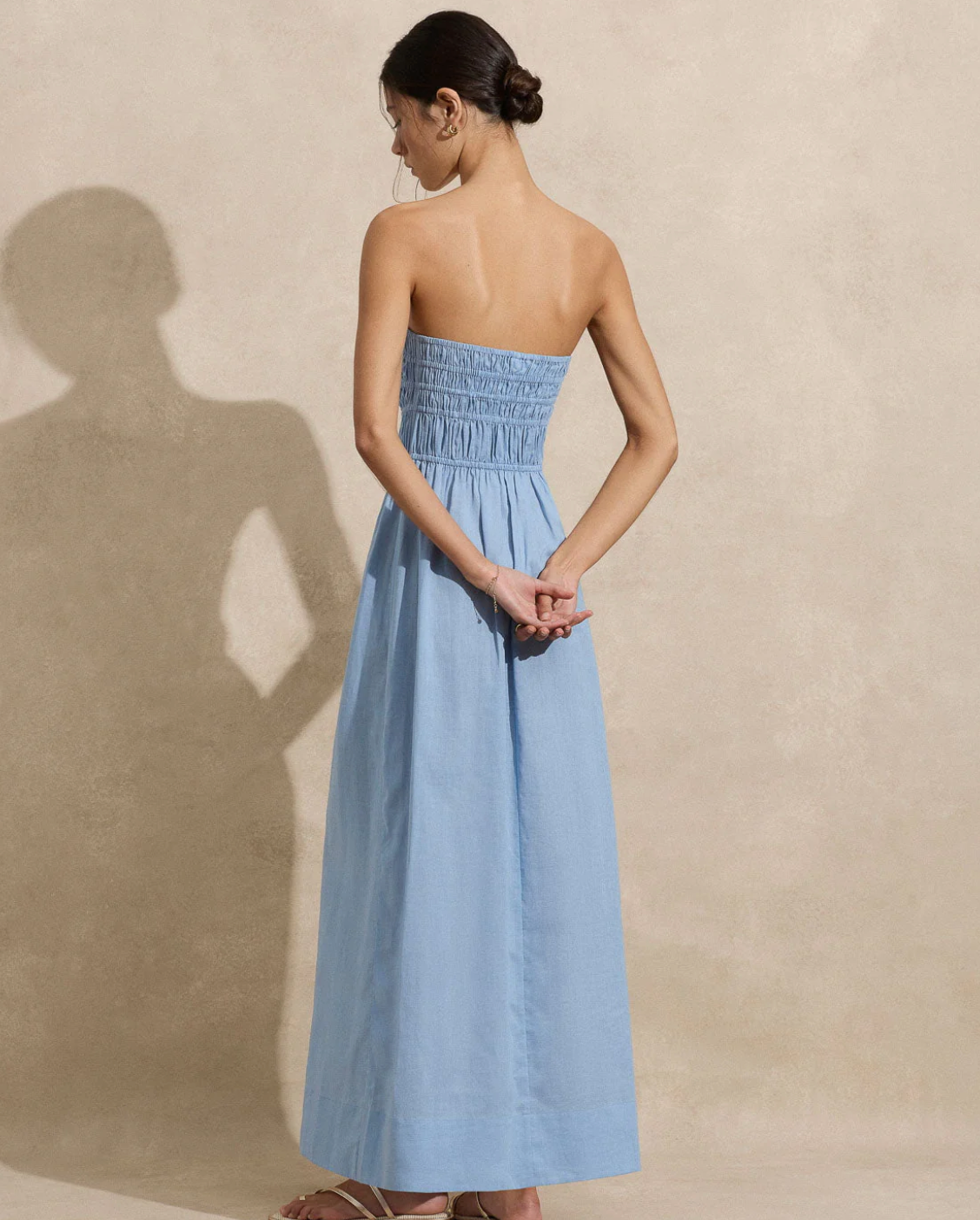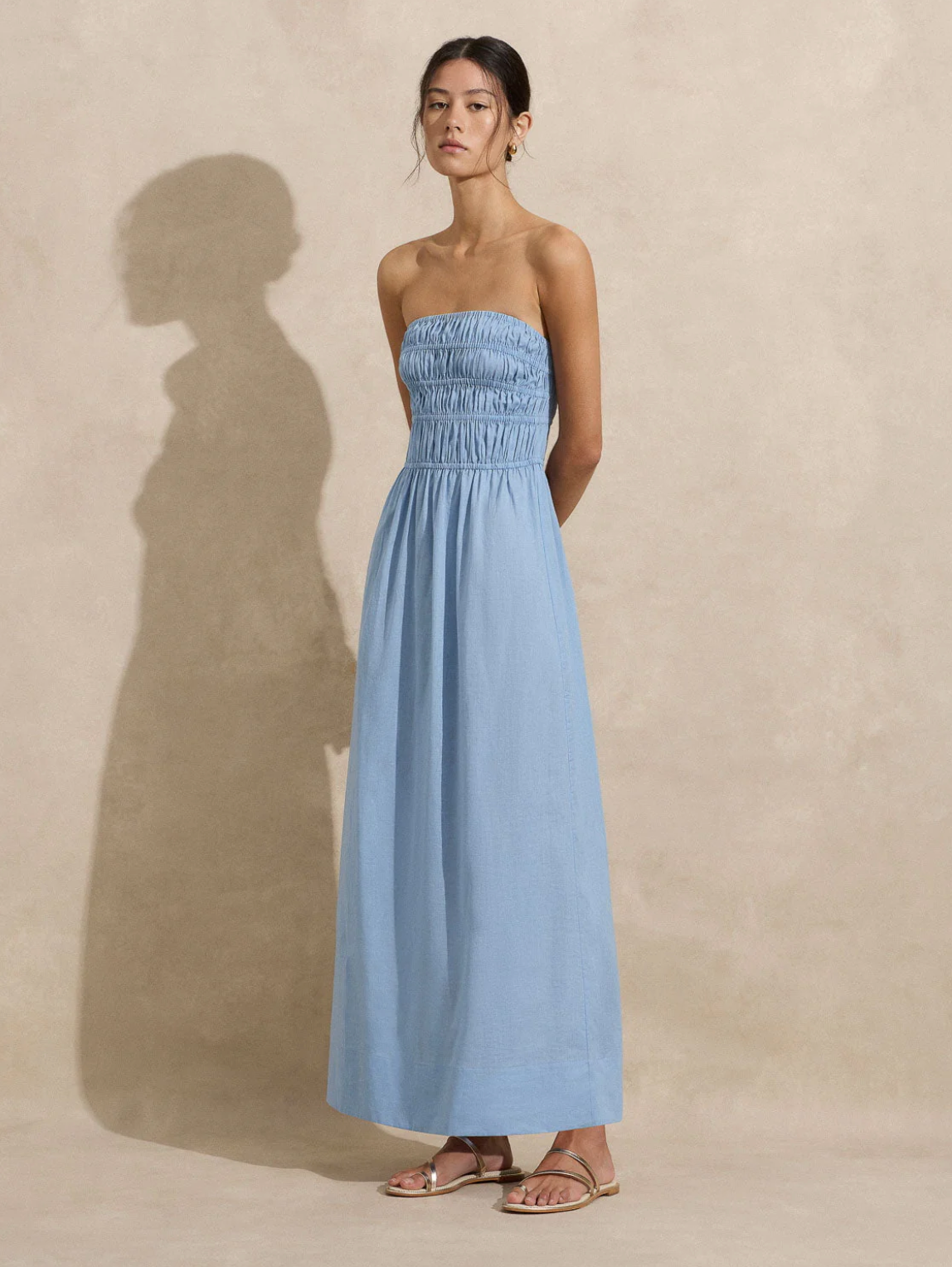 Maxi style strapless dress.Elasticated over bust for a versatile fit.Garment is not lined for an airy, lightweight feel.Made from a beautifully lightweight and softly textured blend of linen and cotton.