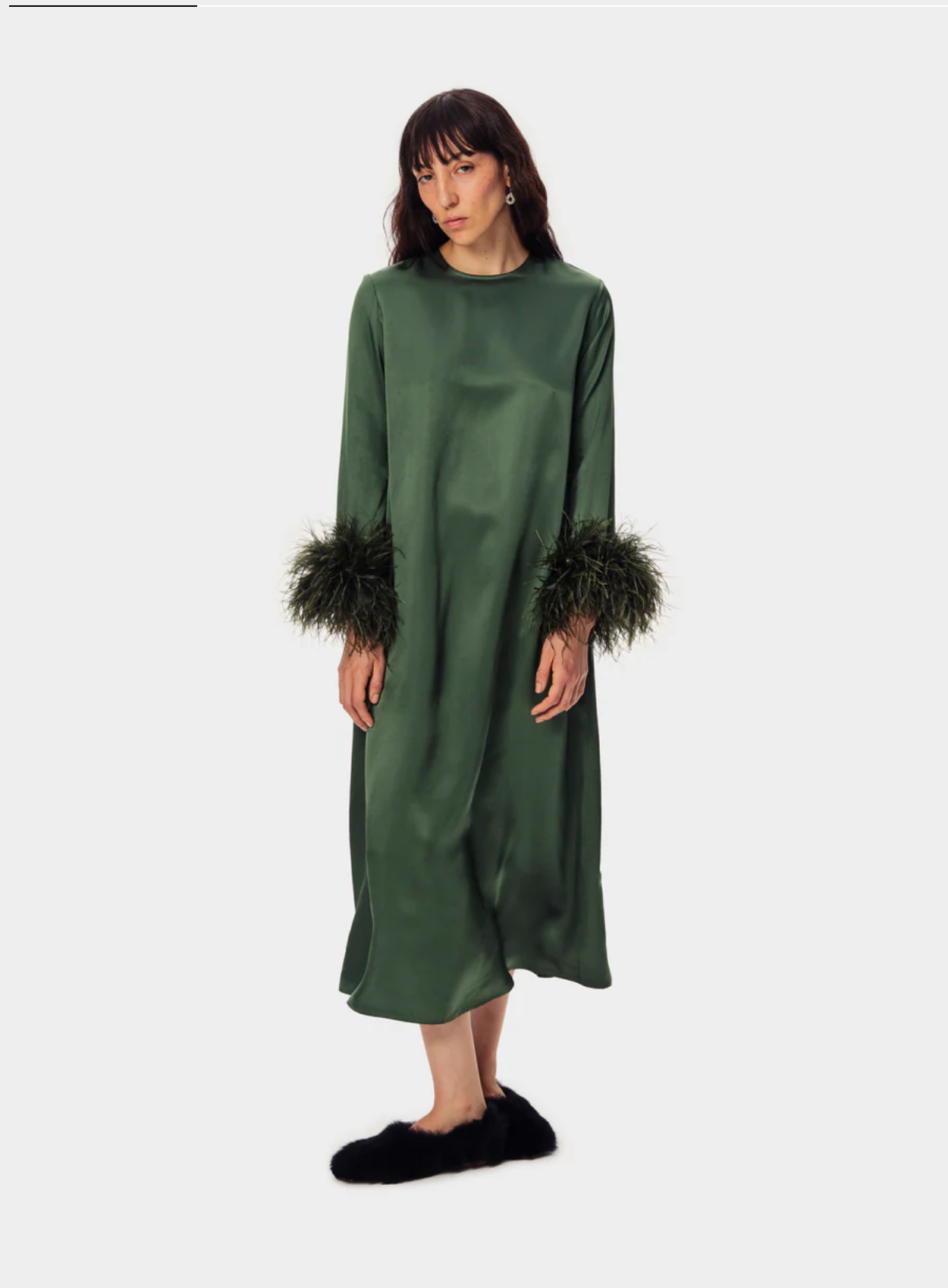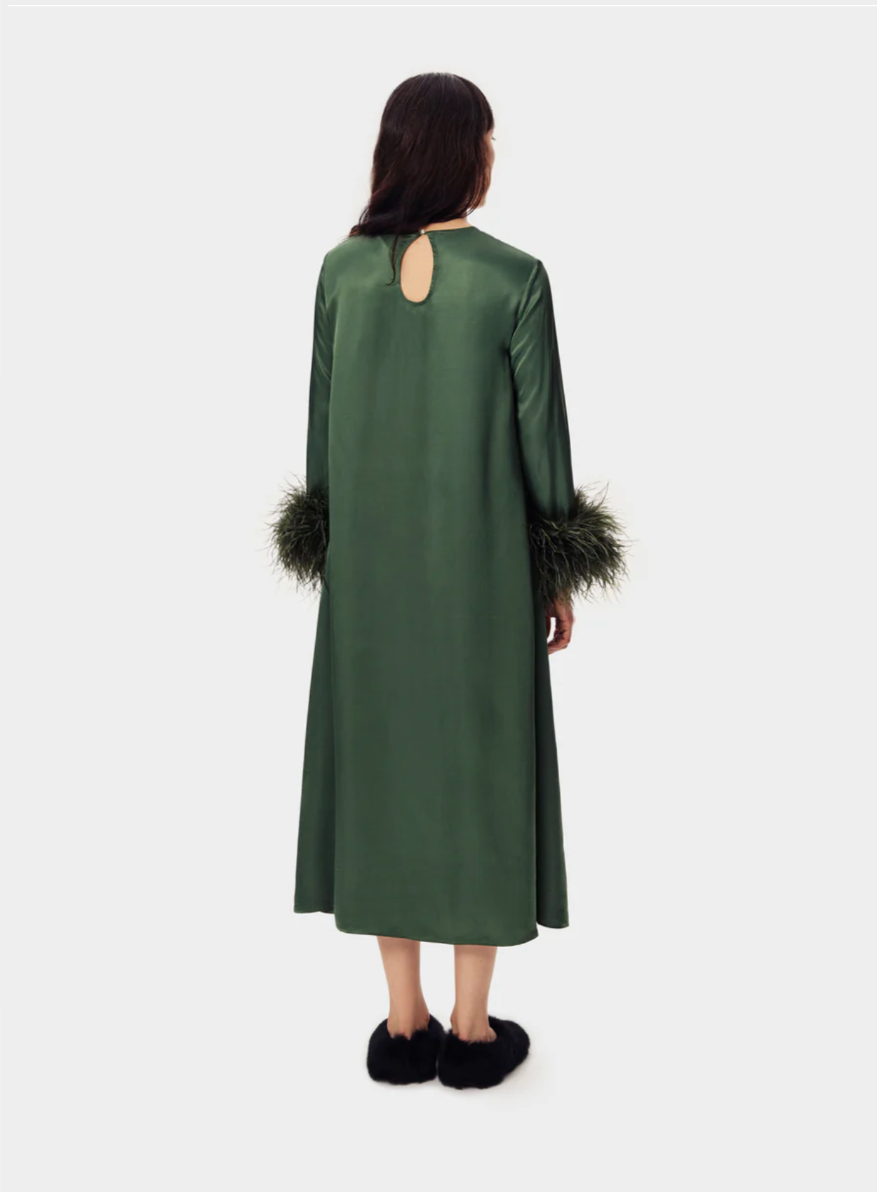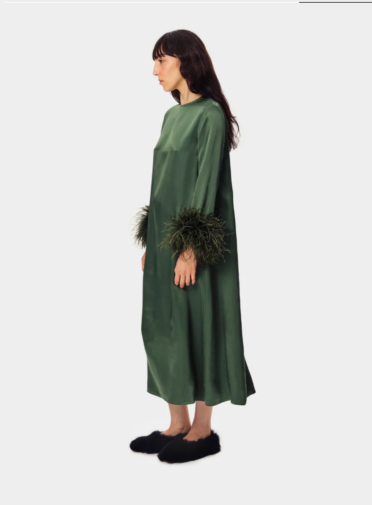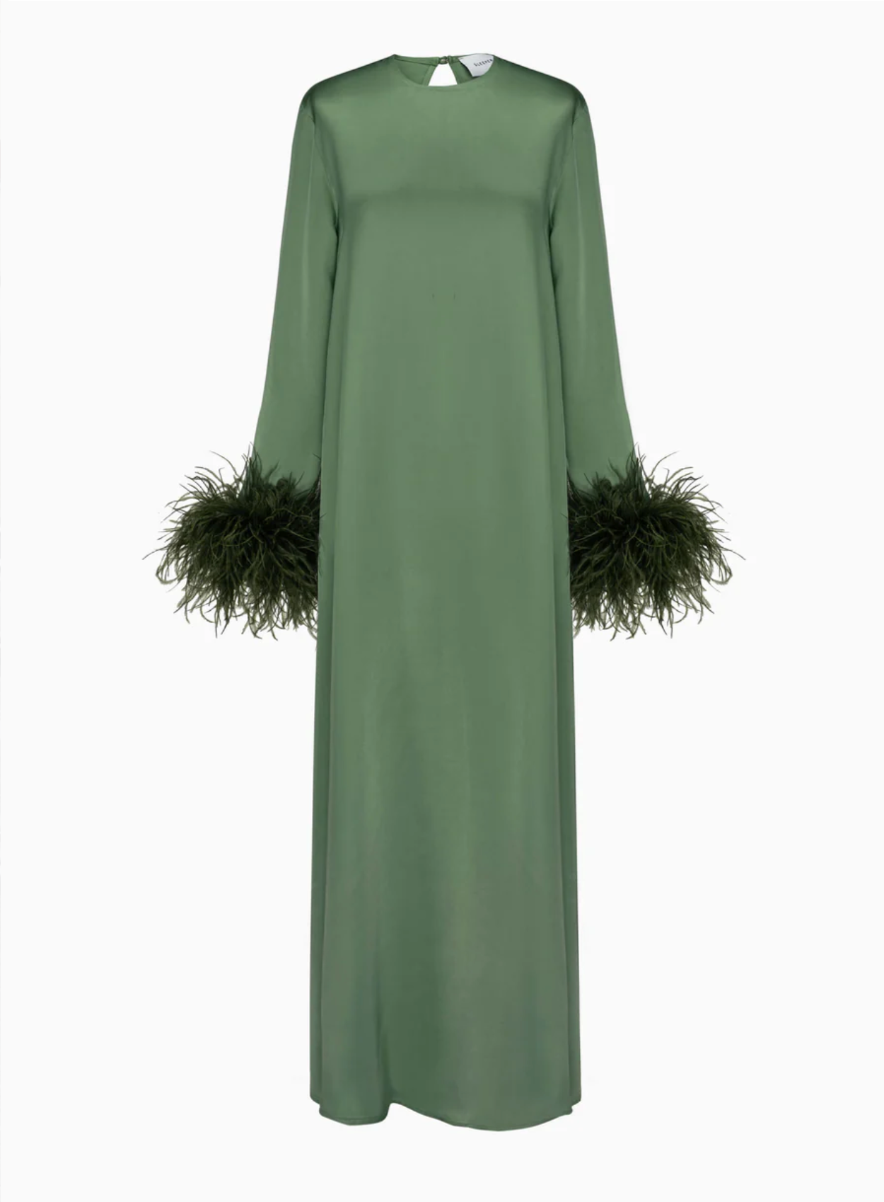 Green maxi dress designed to wear on special occasions, and beyond. A loose silhouette is cut from gentle, breathable viscose with a STANDARD 100 by OEKO-TEX® certification. Its round neckline closes at the back with a single pearl button loop, while sleeve cuffs are finished with a generous layer of detachable ostrich feathers.