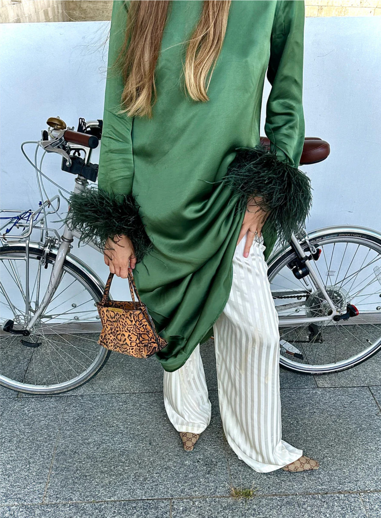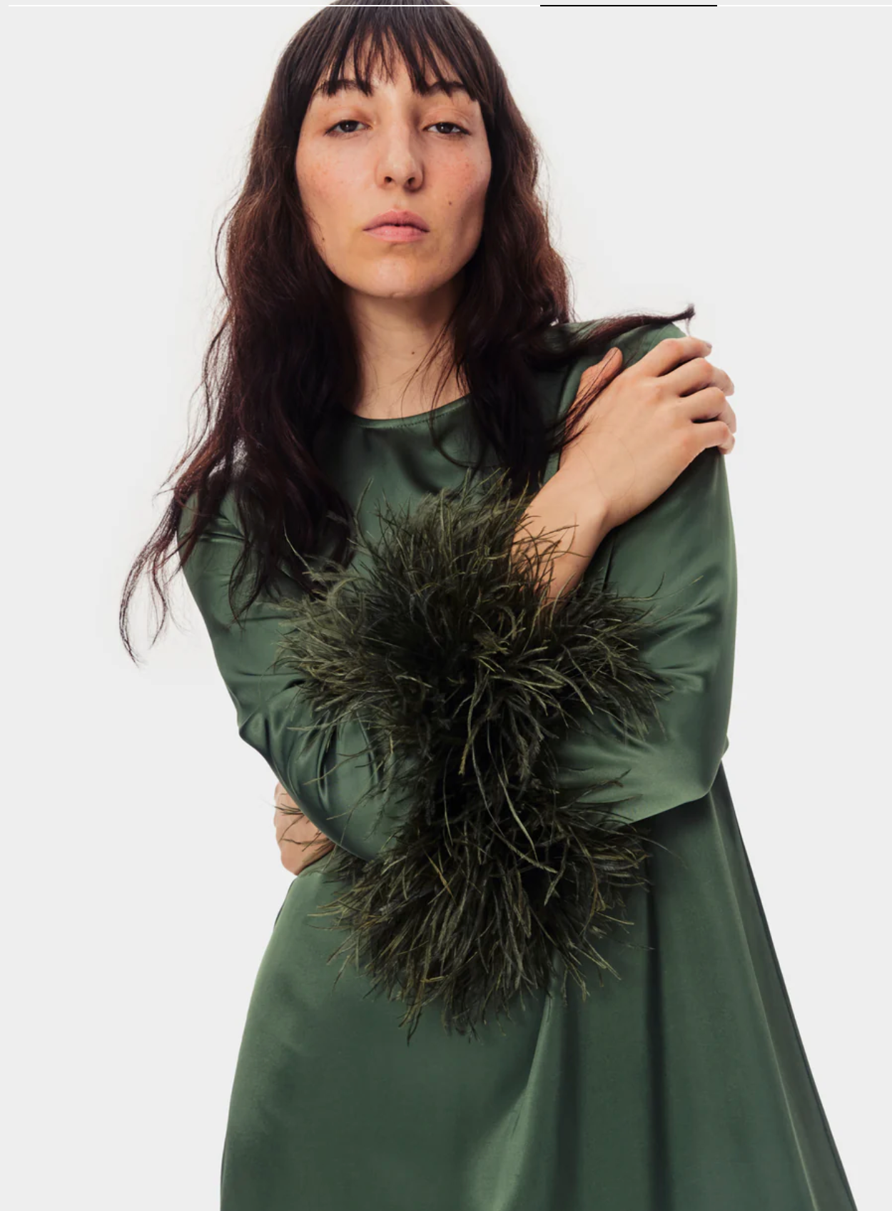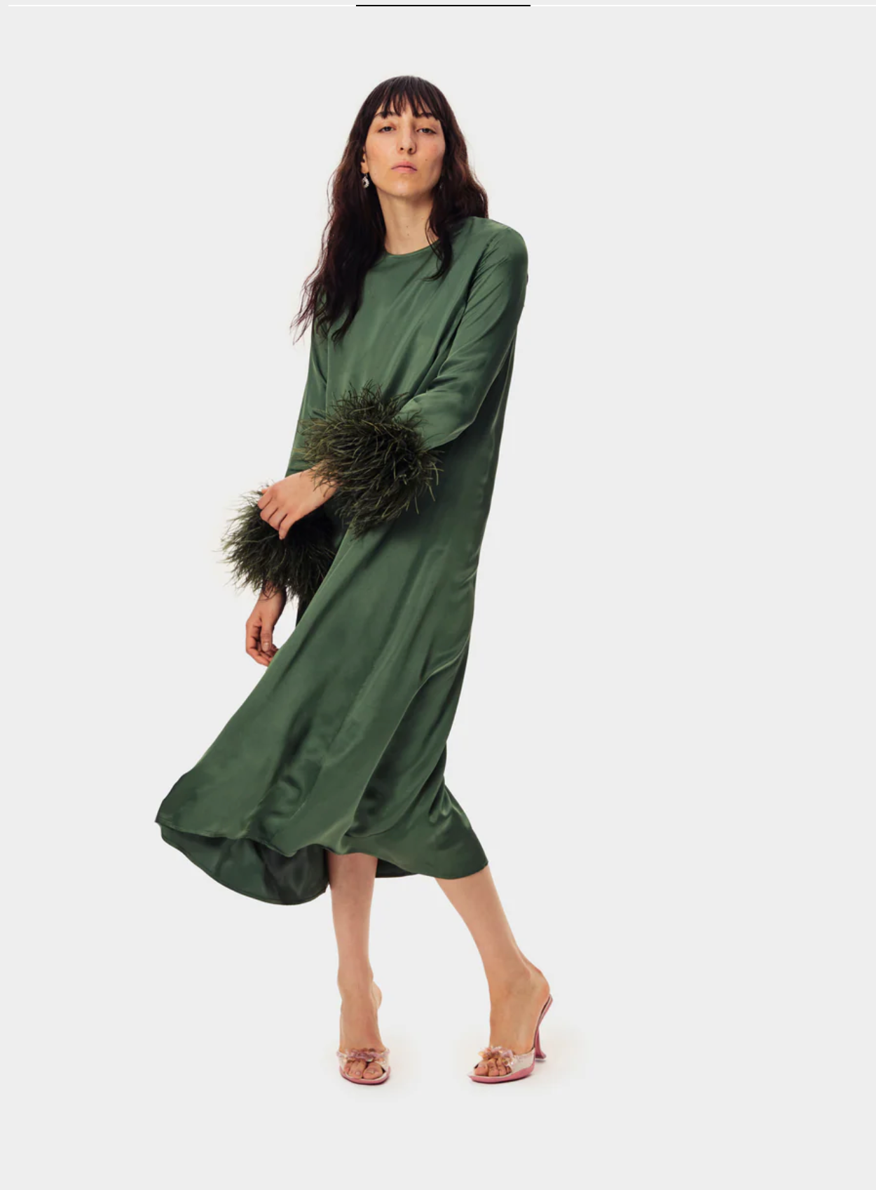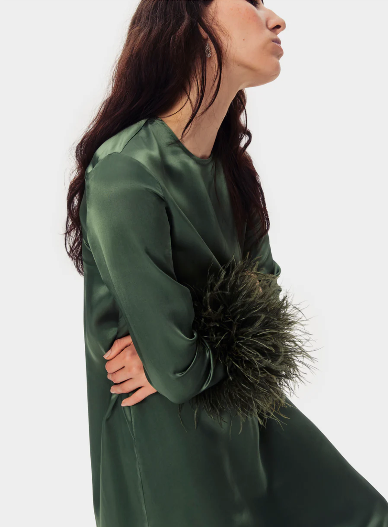 Green maxi dress designed to wear on special occasions, and beyond. A loose silhouette is cut from gentle, breathable viscose with a STANDARD 100 by OEKO-TEX® certification. Its round neckline closes at the back with a single pearl button loop, while sleeve cuffs are finished with a generous layer of detachable ostrich feathers.