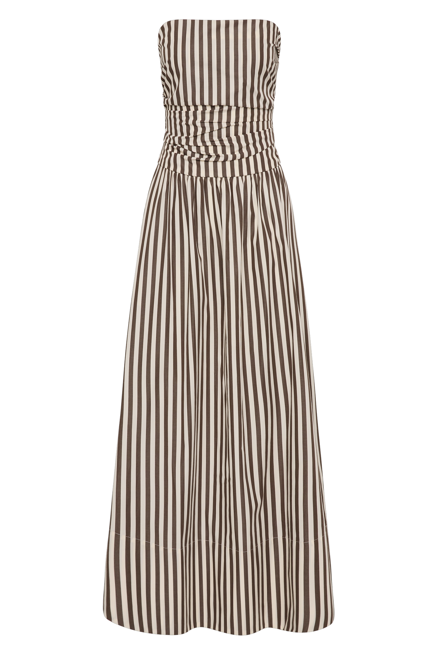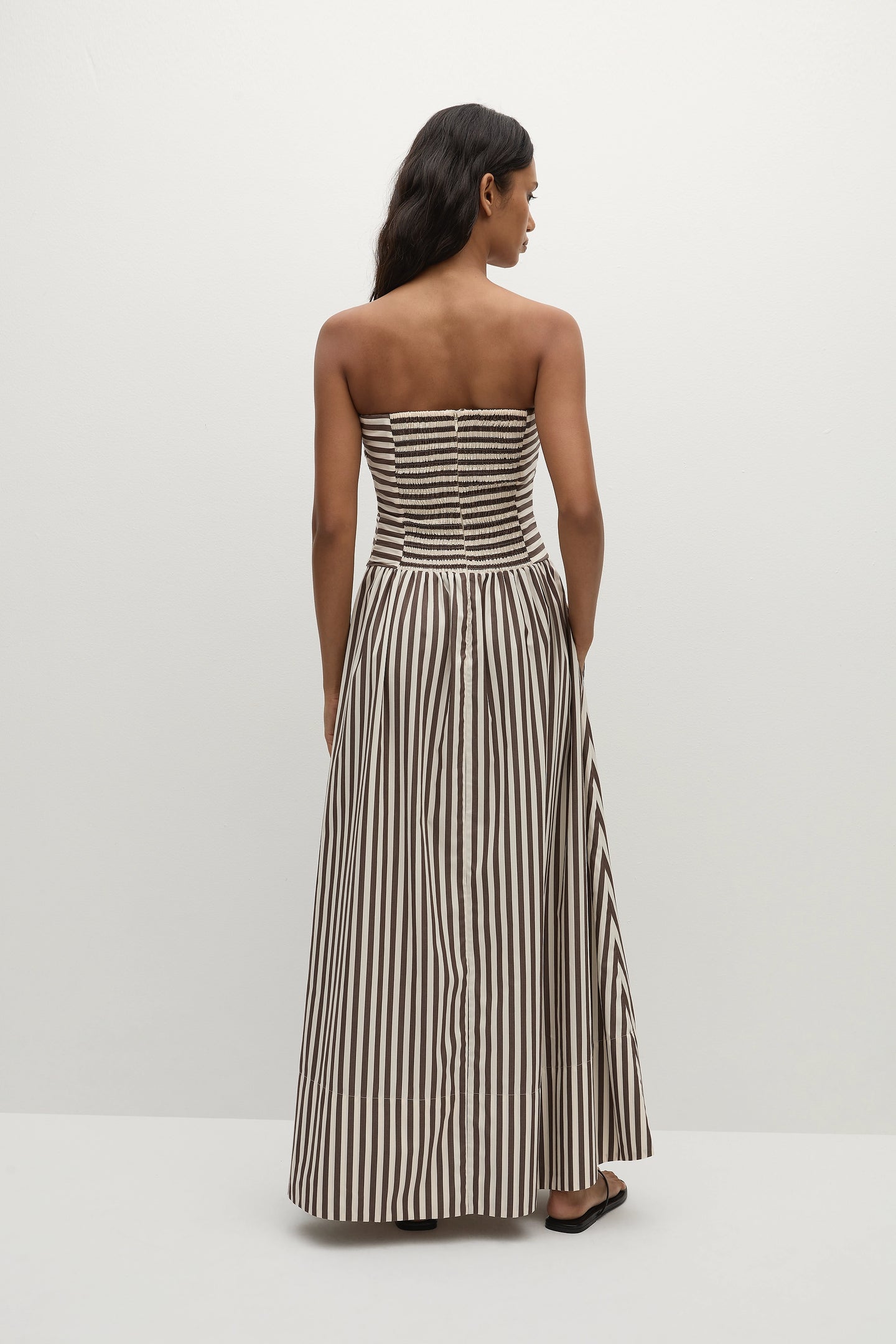 A new iteration of the beloved Hedy Maxi Dress, designed from 100% BCI Certified cotton in a chocolate brown and white stripe, inspired by the clean lines of Scandinavian style. A strapless maxi dress with a fitted bodice, shirred at the back and gathered at the front. From there it features a drop waist with a soft gathered skirt that flares into a slight A-line, cropping below the ankles. Style with a simple sandal or heel for day to night occasionwear.