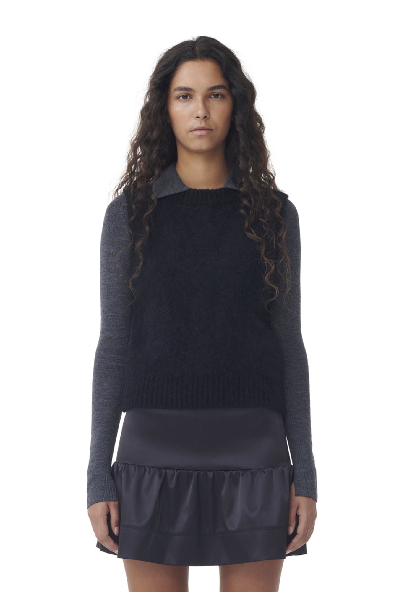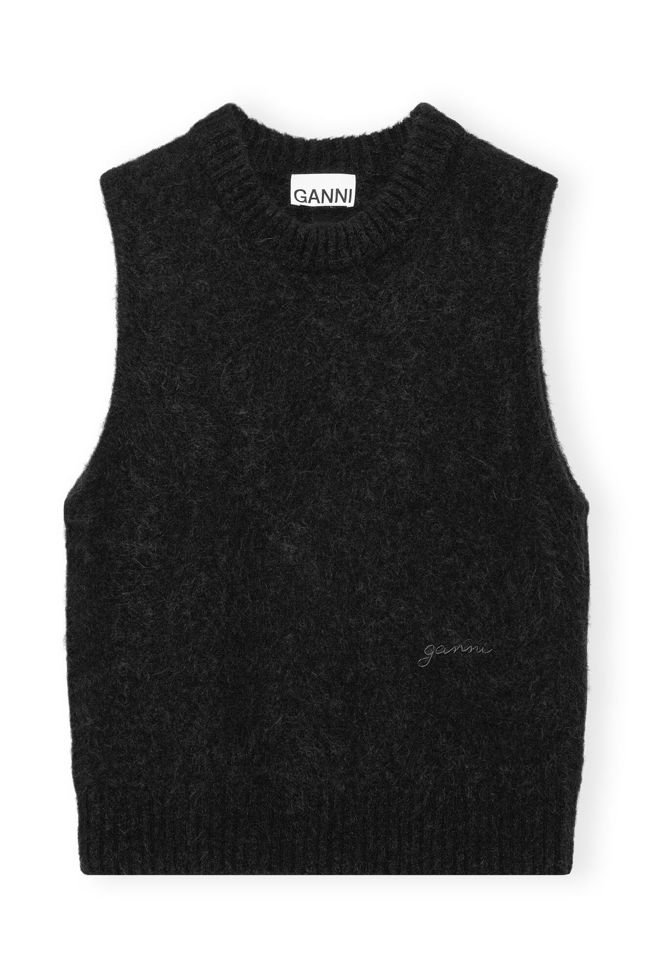 This Black Brushed Alpaca O-Neck Vest is made from alpaca, polyamide, wool and elastane. The sweater is designed for a regular fit and features an O-neckline, embroidered GANNI logo and ribbed edges.