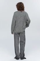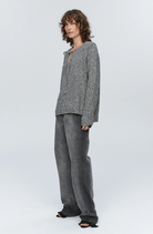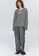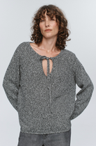 The Gabrielle Jumper is crafted in a black and ivory melange cotton knit. This jumper features a round neckline with a soft V at the centre front, secured with a tie closure. This jumper has long sleeves and a relaxed fit through the body, finished with small splits at the side hem.