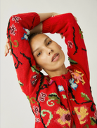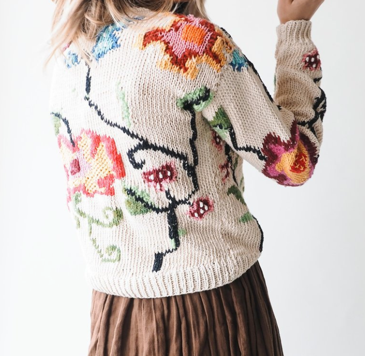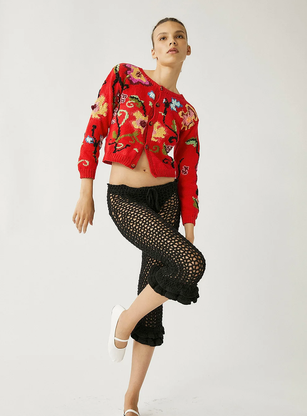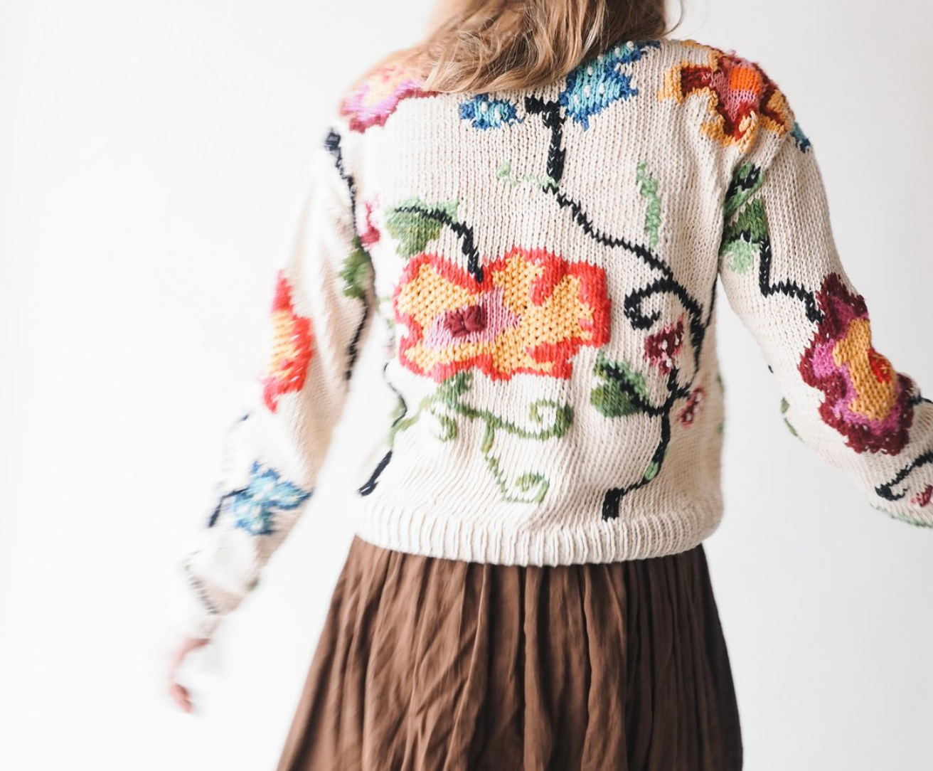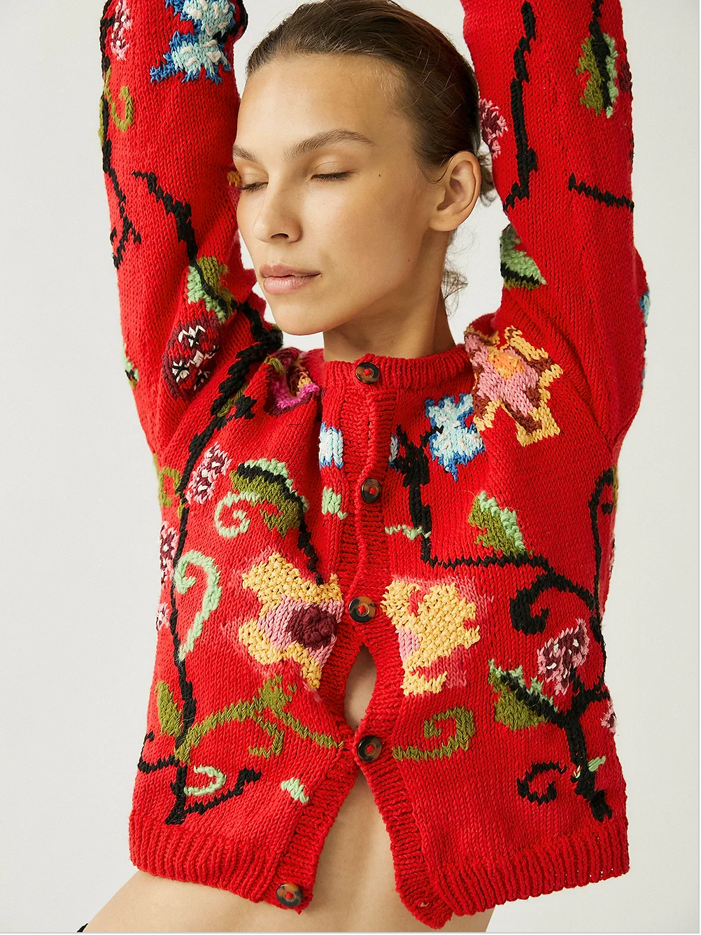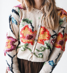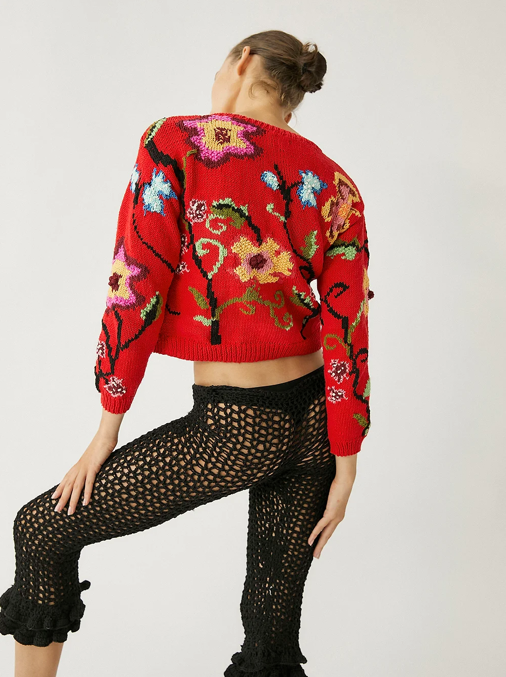 Hand knit, long sleeve cardigan with a colorful floral pattern. - 100% cotton - button closure Made by TACH May show slight imperfections / variations due to hand knit nature.
