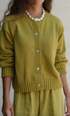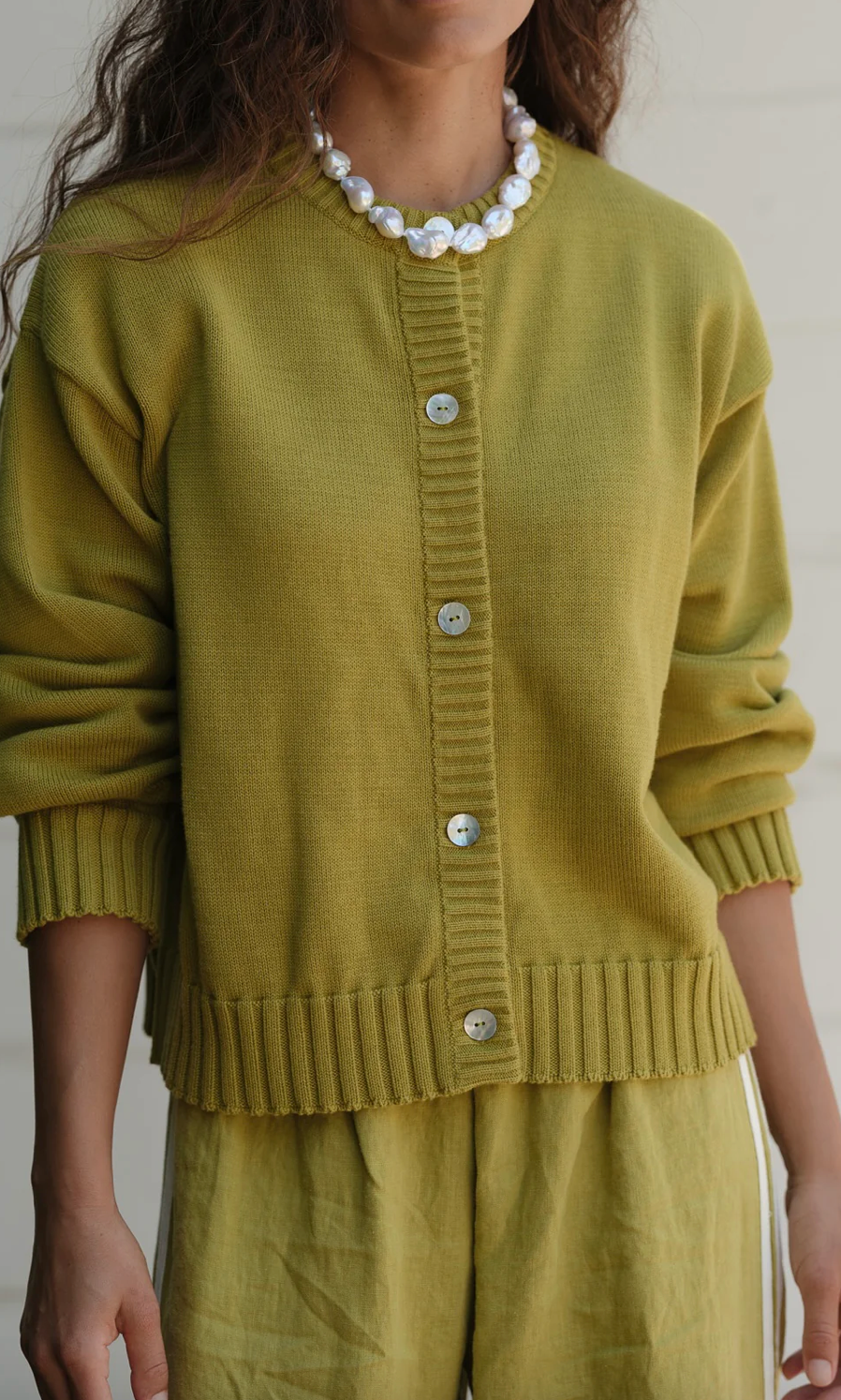 The Cotton Knit Cardigan is crafted with 100% Organic Cotton, featuring a slightly oversized fit, mother of pearl buttons and ribbed edges.