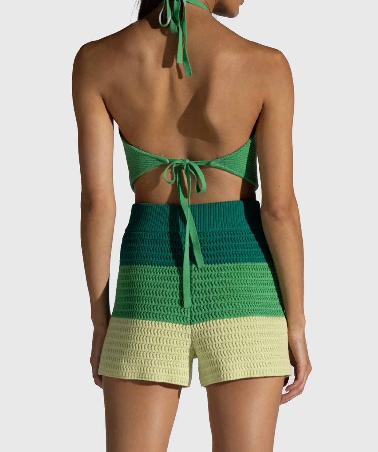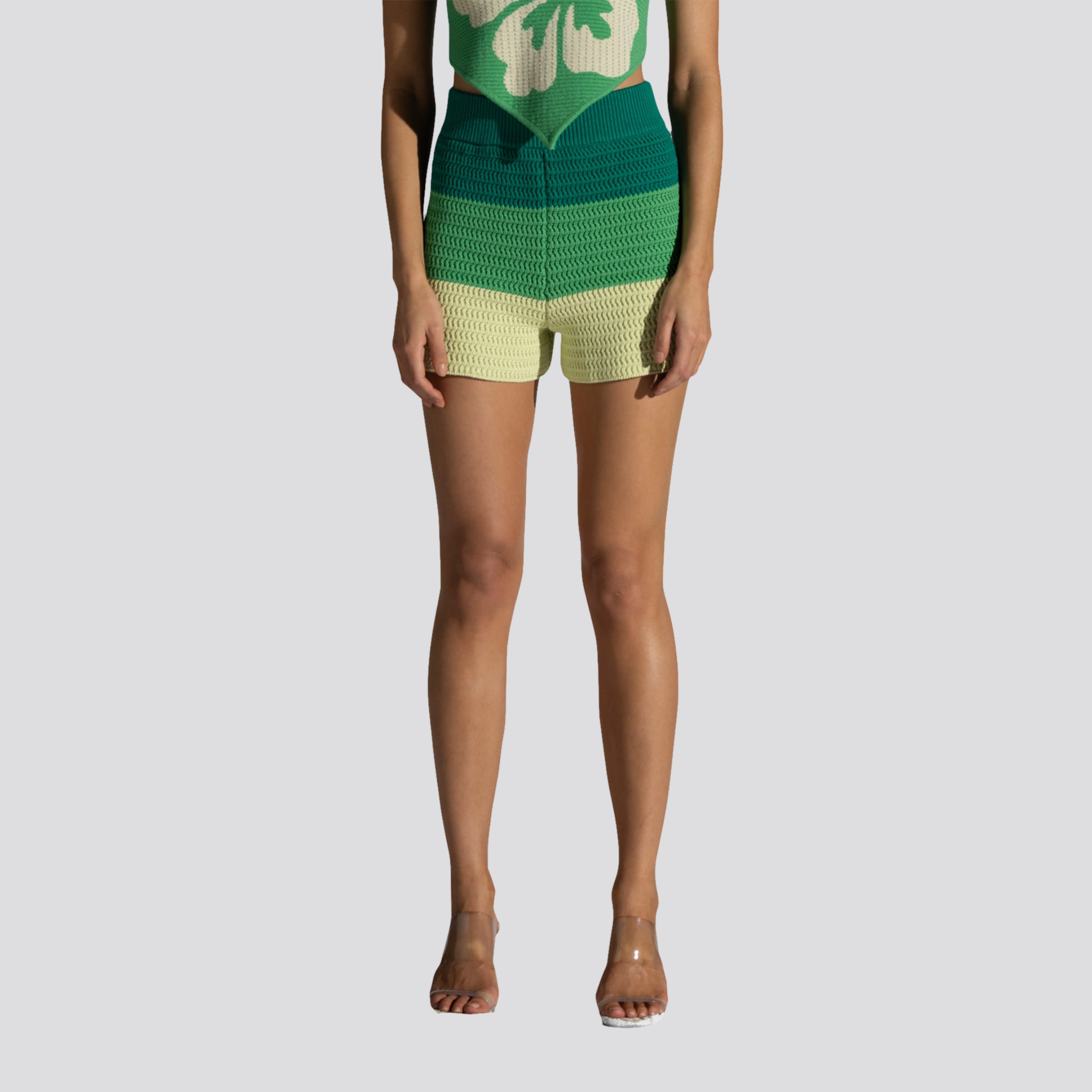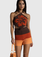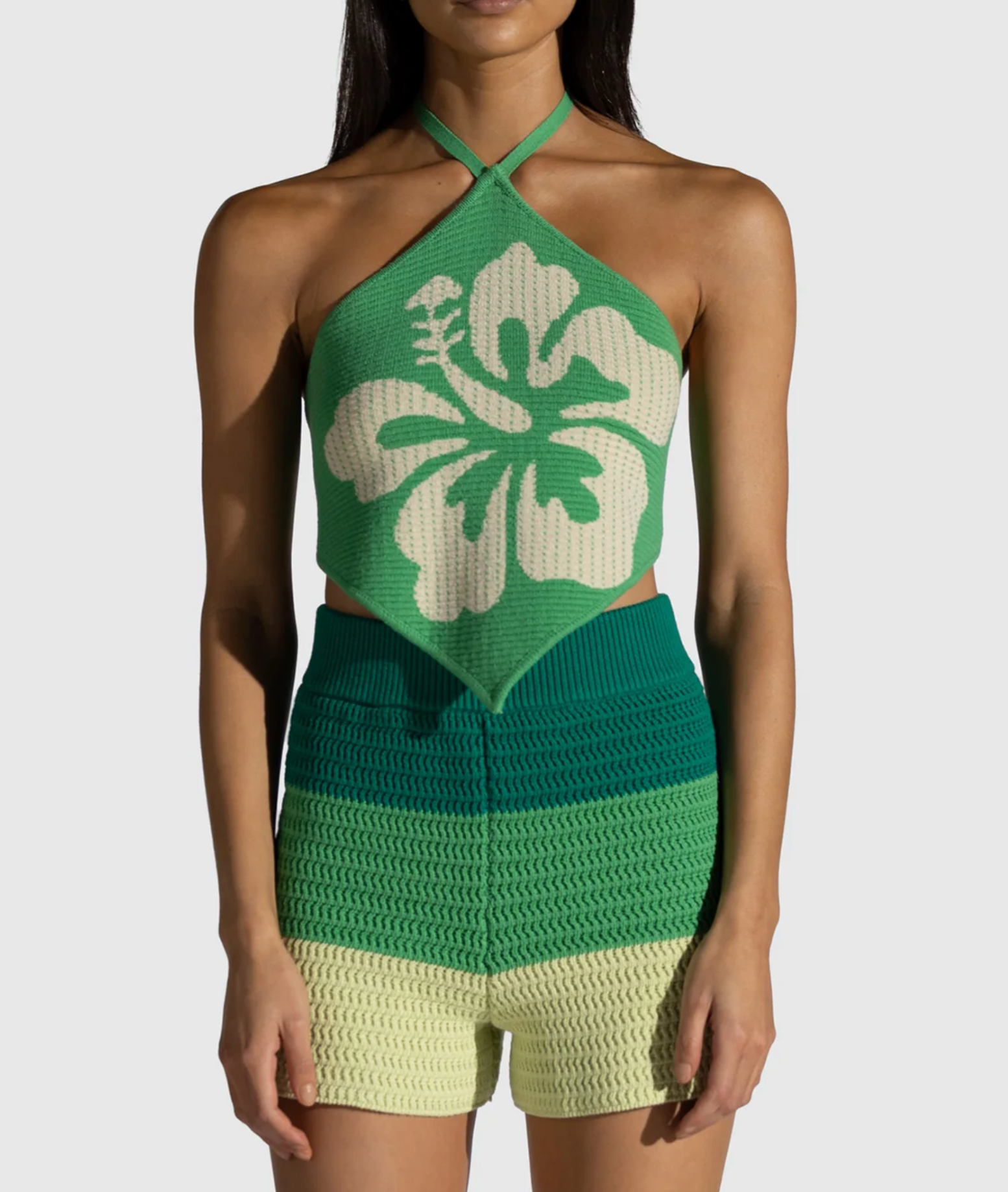 The Kai Knit Shorts are a crochet style knit with a high waist and slightly flared hem for a flattering fit. The Hibiscus Knit Top is a perfect match for a summer set that can be worn at the lounge, beach, or bar!