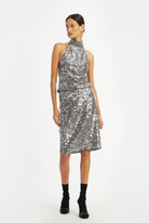 NET SEQUIN MIDI SKIRT IN DARK GREY FEATURES A HIGH-WAISTED SILHOUETTE WITH A STRAIGHT CUT. A CONCEALED BACK ZIPPER ENSURES A SECURE FIT, WHILE THE HEMLINE MAINTAINS A CLEAN EDGE.